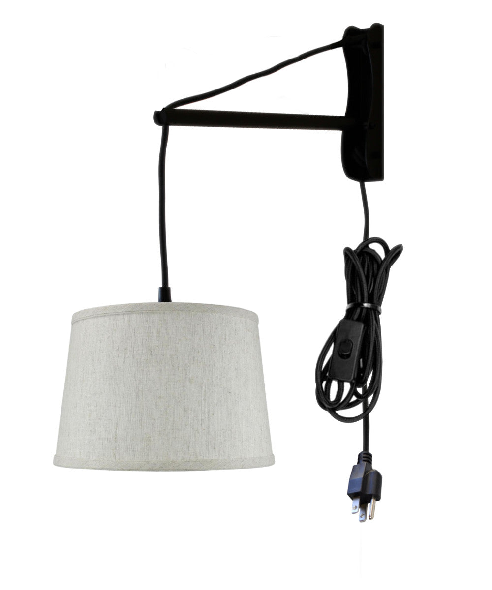 12"W MAST Plug-In Wall Mount Pendant 1 Light Black Cord/Arm Shallow Drum Textured Oatmeal Shade