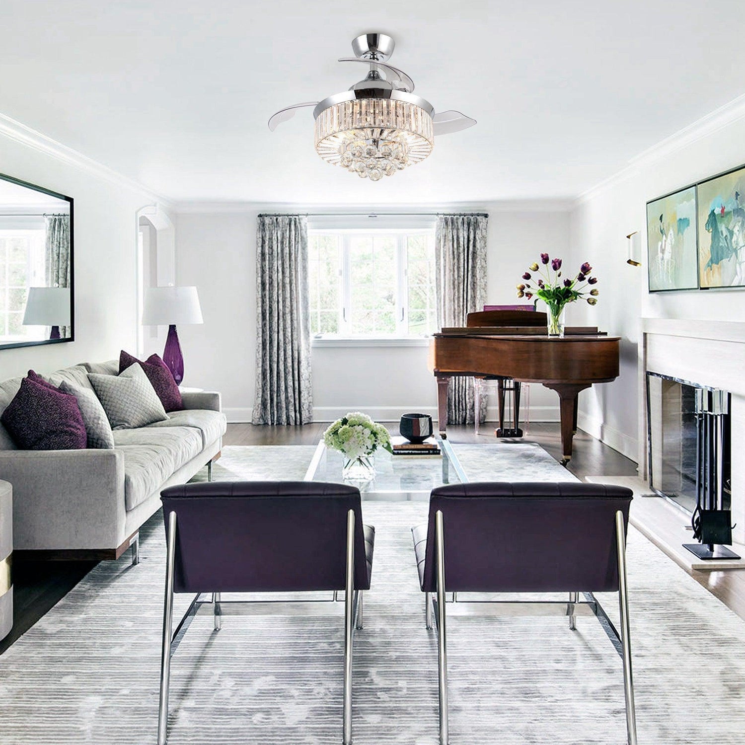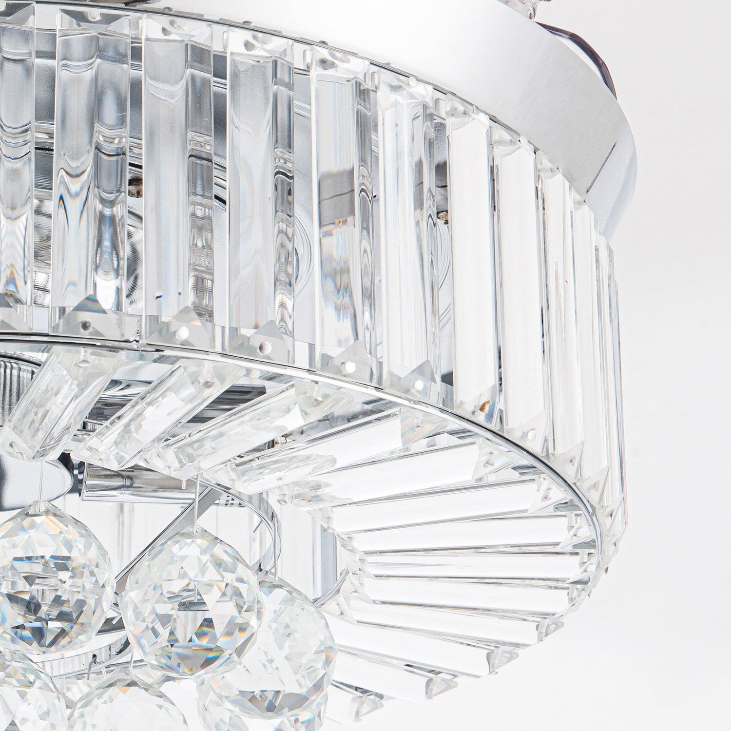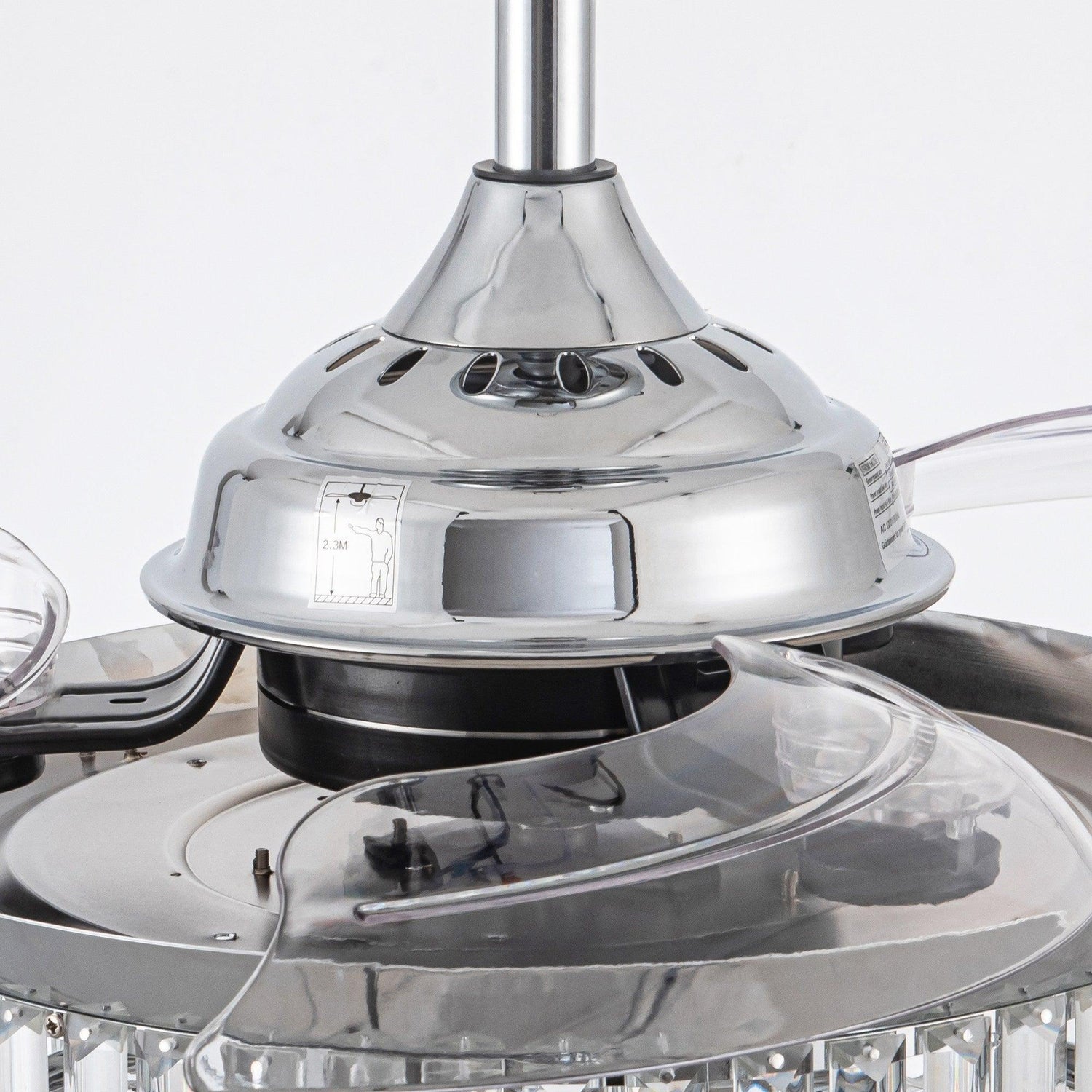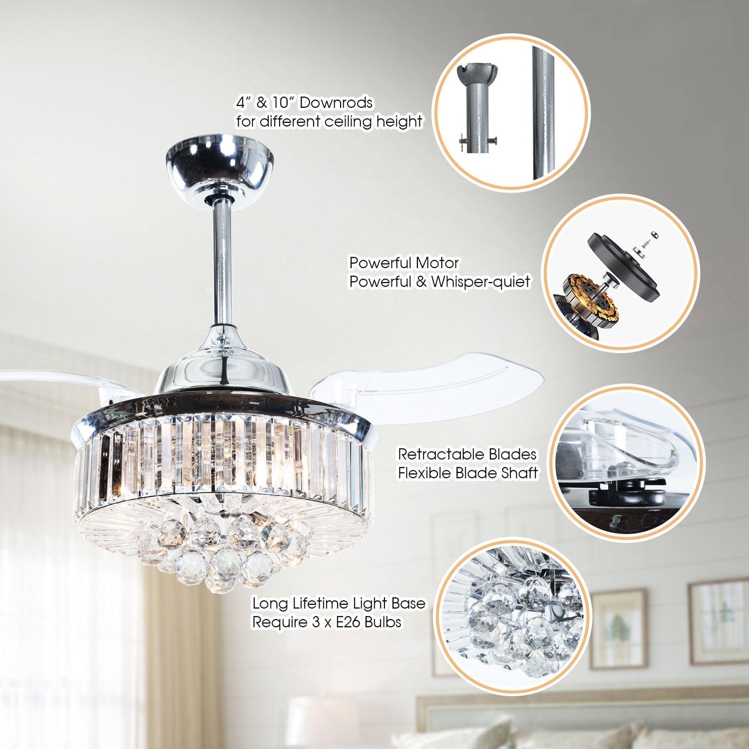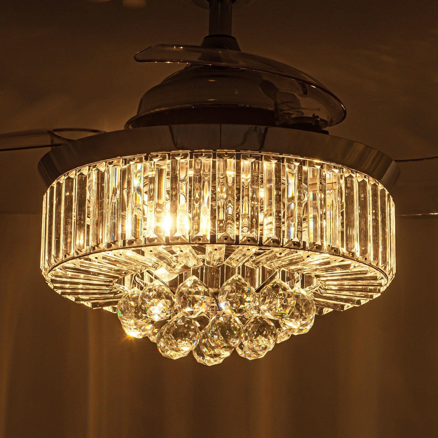 The 3-blade crystal chandelier ceiling fan with light, fan speed, and light can be controlled separately. Provided both functions of traditional lamps and fans. That makes it very convenient for you to use in the living room, bedroom, and so on. When you turn on the ceiling fan, the blades will stretch out, while when you turn off the fan, the blades will put inside automatically. Exclusive motor technology and a remote system ensure your fan will remain Quiet for life.