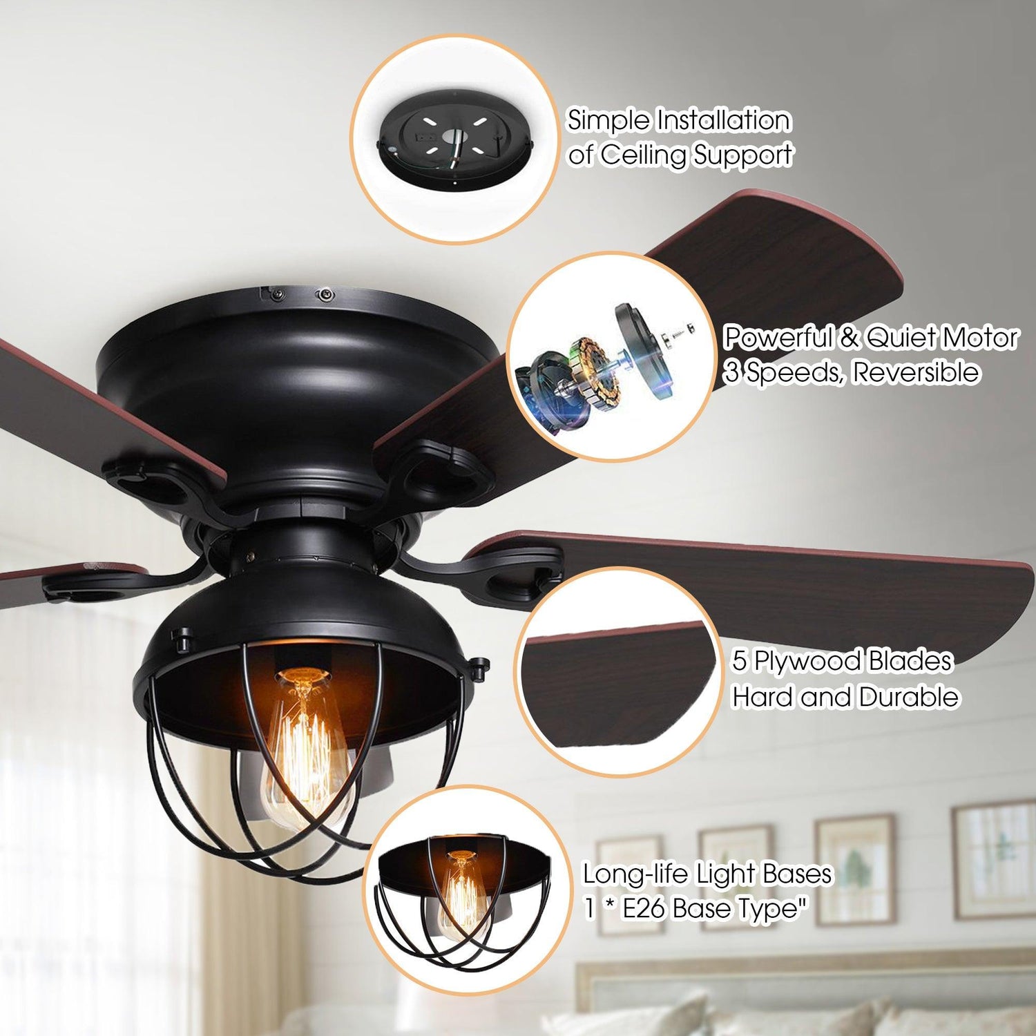 Through its casual style and charming appearance, this fan will compliment your decor without overpowering it. Clean line details work together throughout the fan body, wood blade light brown finishes, and cage bowl light kit to create a coherent design with wide appeal. The 42-inch. blades and low-profile motor housing make this fan a perfect fit for small rooms or low ceilings.