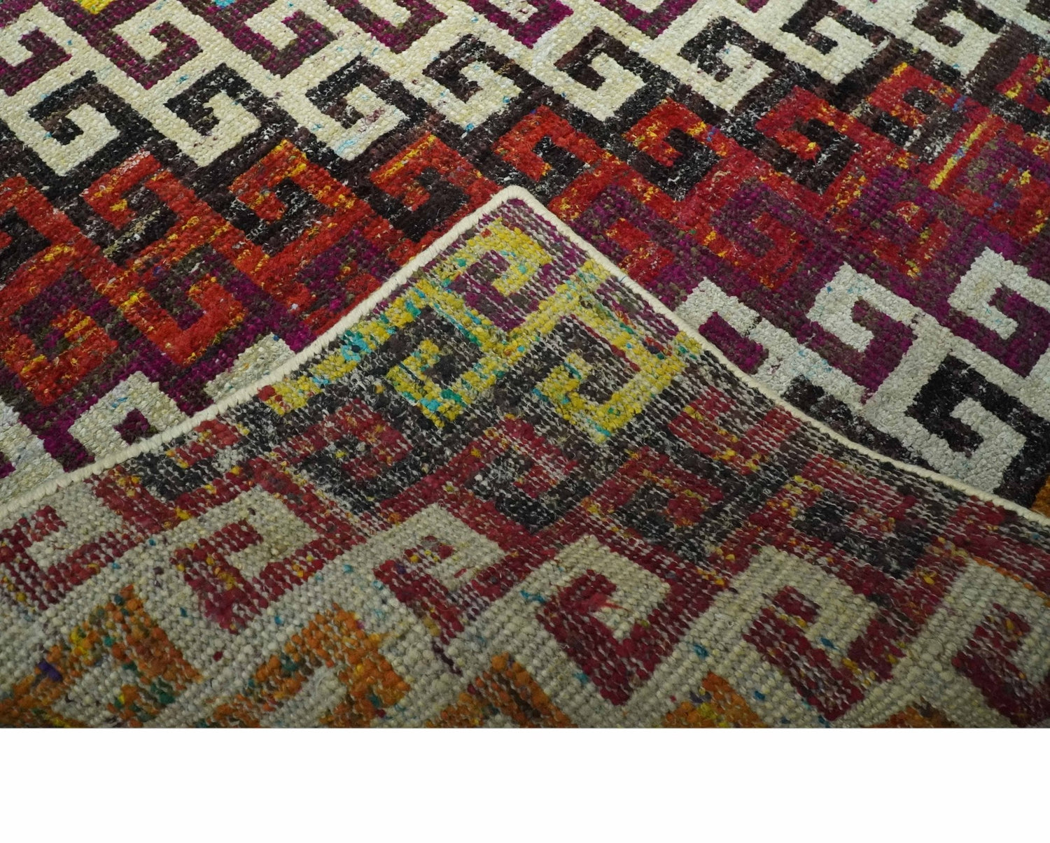 5.6x8.6 Ivory, Rust, Black and Mustard Greek key design Hand Knotted wool area rug