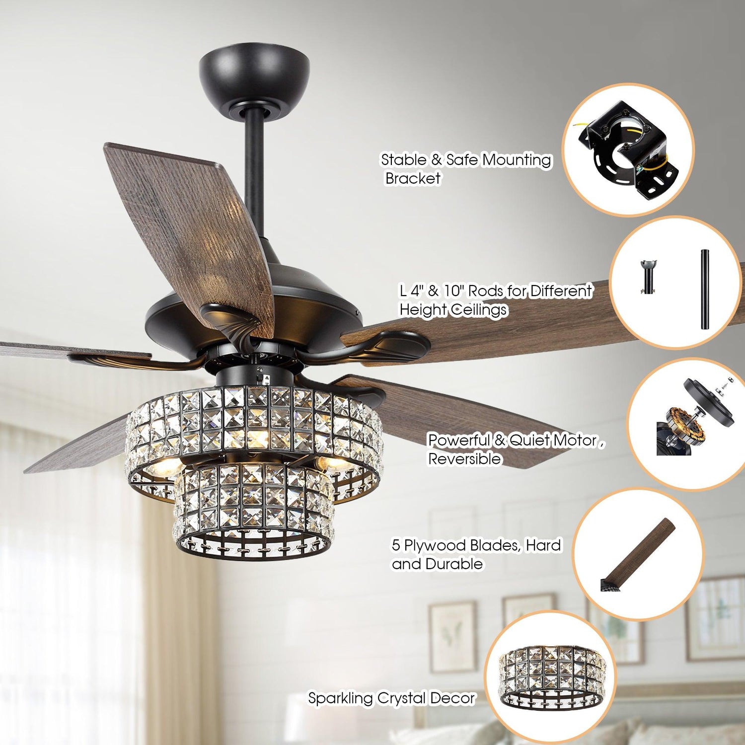 52" | Iron, Plywood, Crystal | D1"-L4"&L10" | 5*Plywood blades | AC | 4*E12 lamp holders no bulbs | Remote control | 3 | Yes | Dry location |