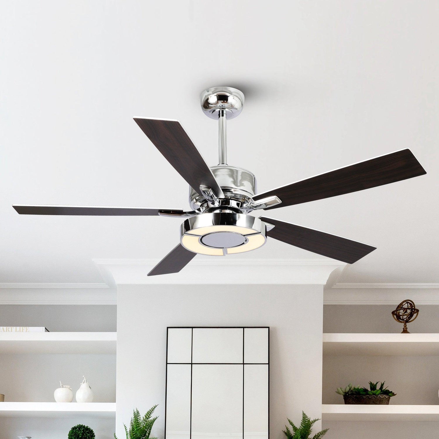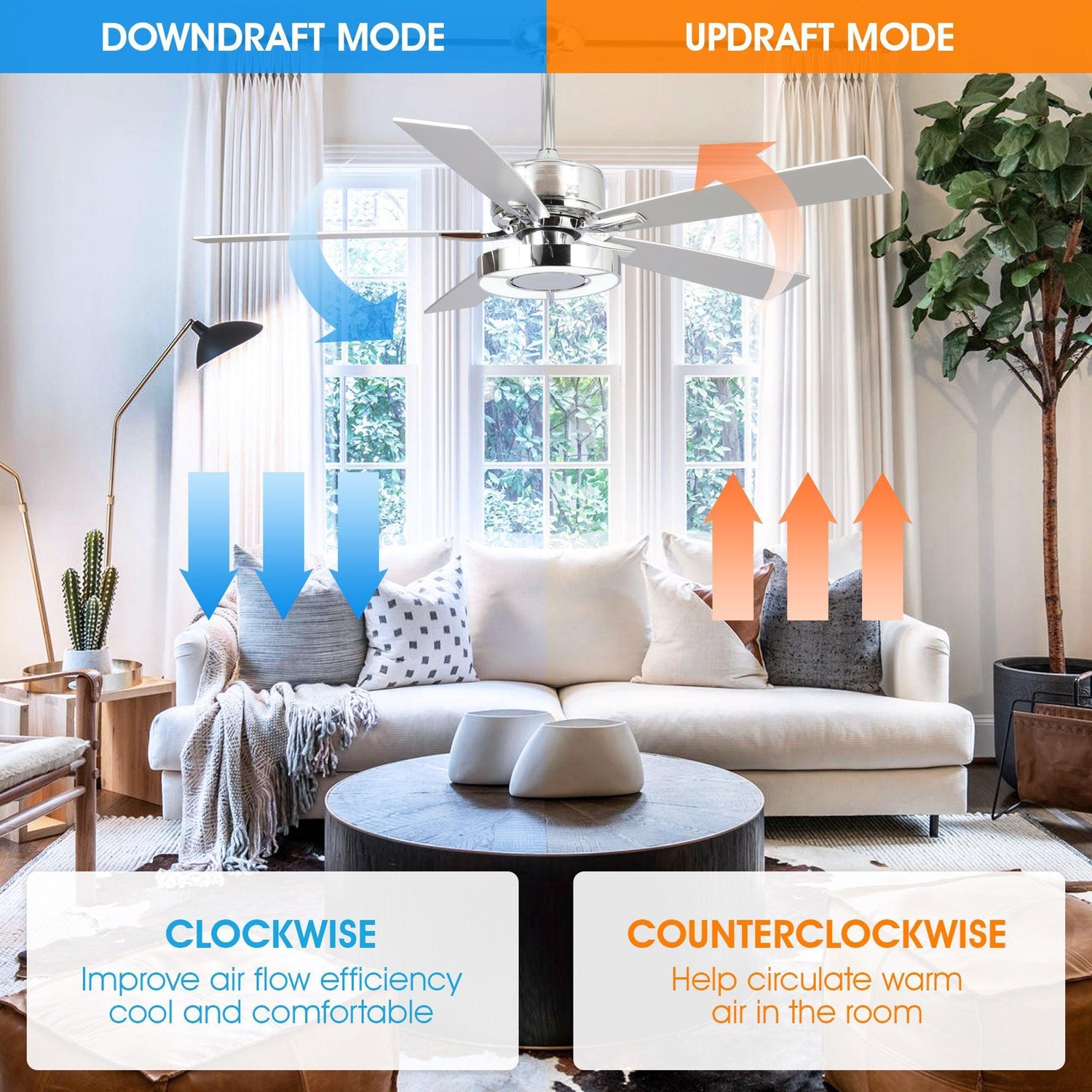 The Vendome 52-Inch Chrome Ceiling Fan is crafted from iron, complemented by a minimalist industrial style and 5 double-sided blades to match many of today's interior style trends. The Vendome comes with an LED light kit, and the included handheld remote control allows for easy operation of the fan's six speeds and light colors.