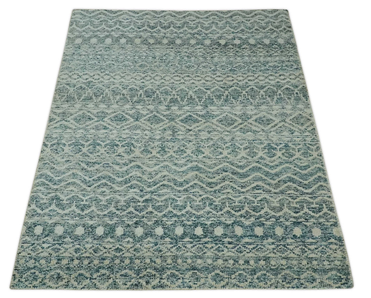 5x7 Teal and Beige Hand knotted southwestern Tribal trellis recycled Art Silk rug