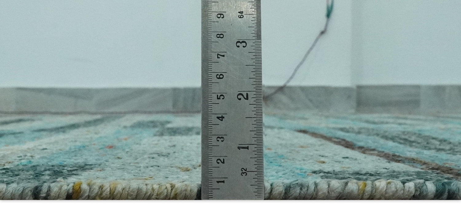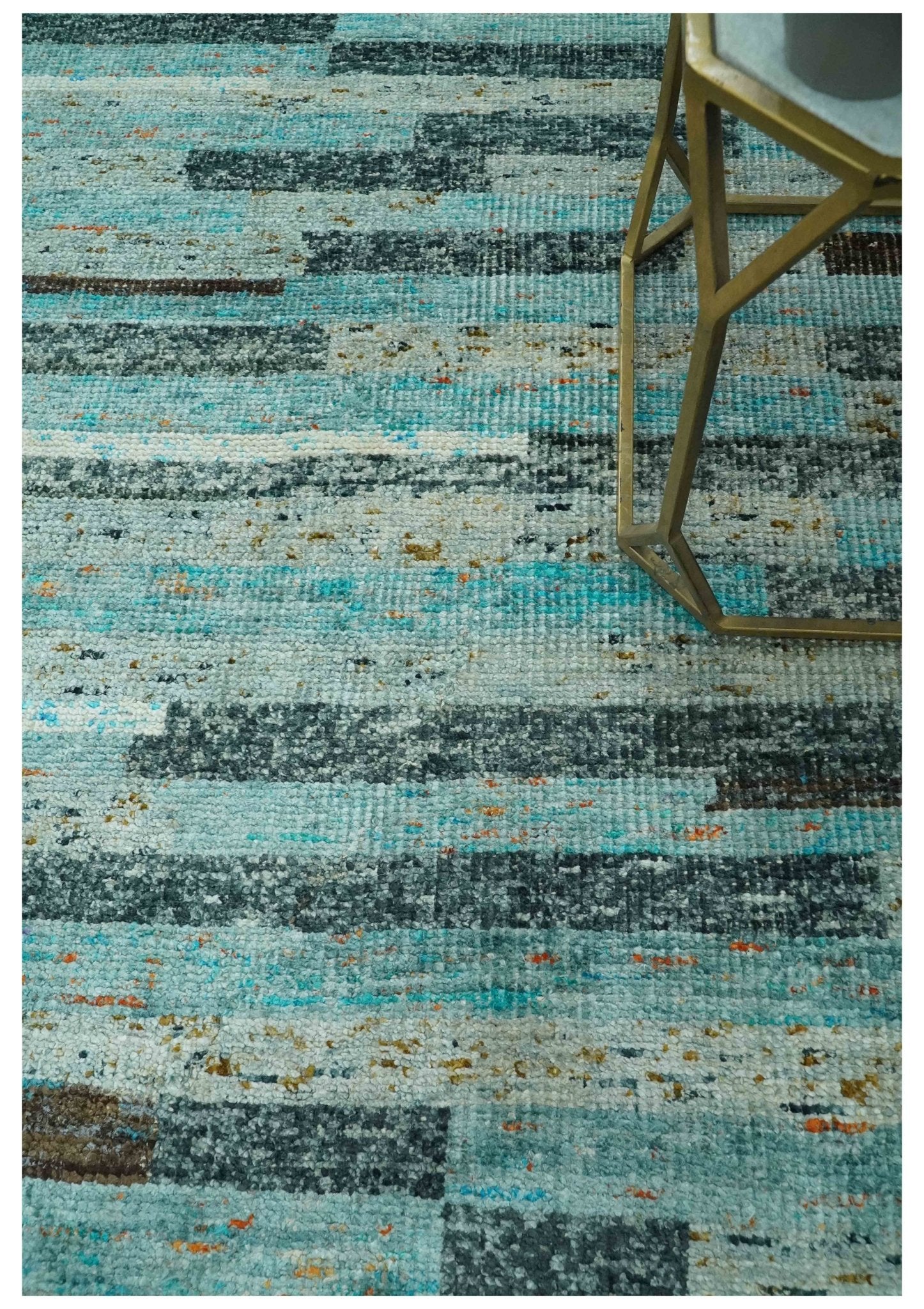 5x8 Modern Geomatical Aqua, Gray and Silver Stripes Design Hand Knotted wool Rug - 5x8 is backordered and will ship as soon as it is back in stock.