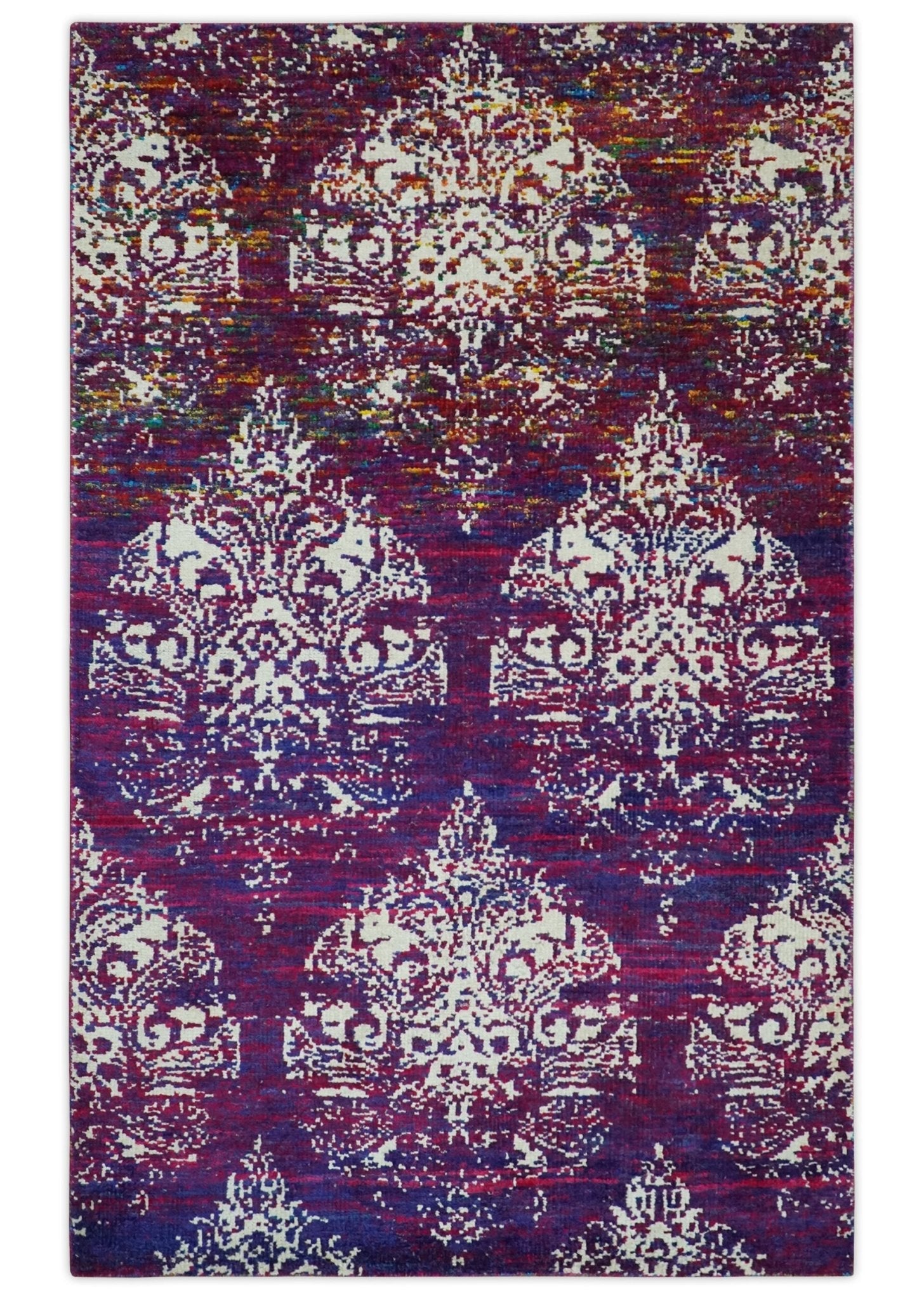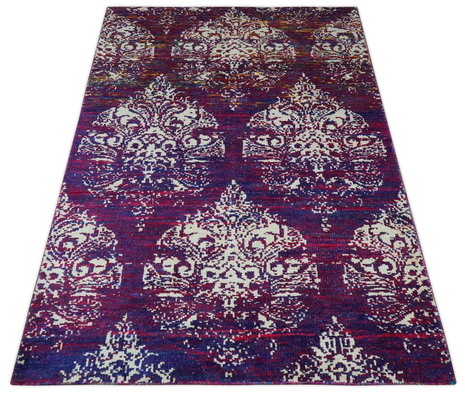 5x8 Purple, Maroon and Ivory Traditional Large Ikat Design Hand Knotted wool Area Rug