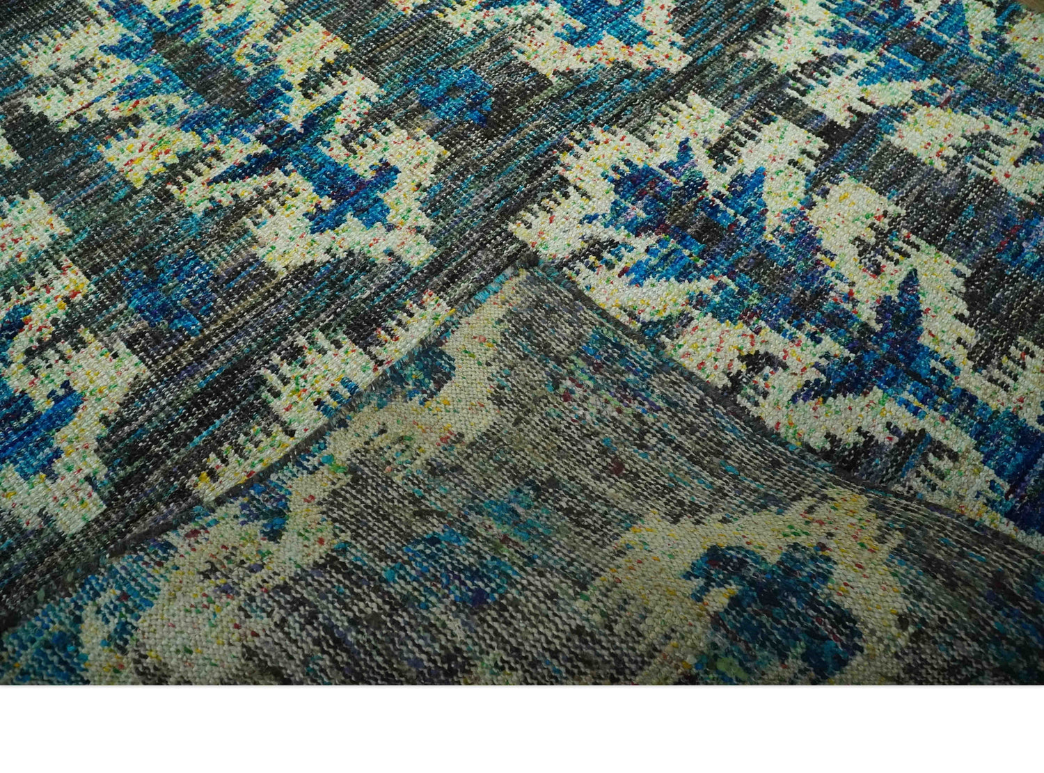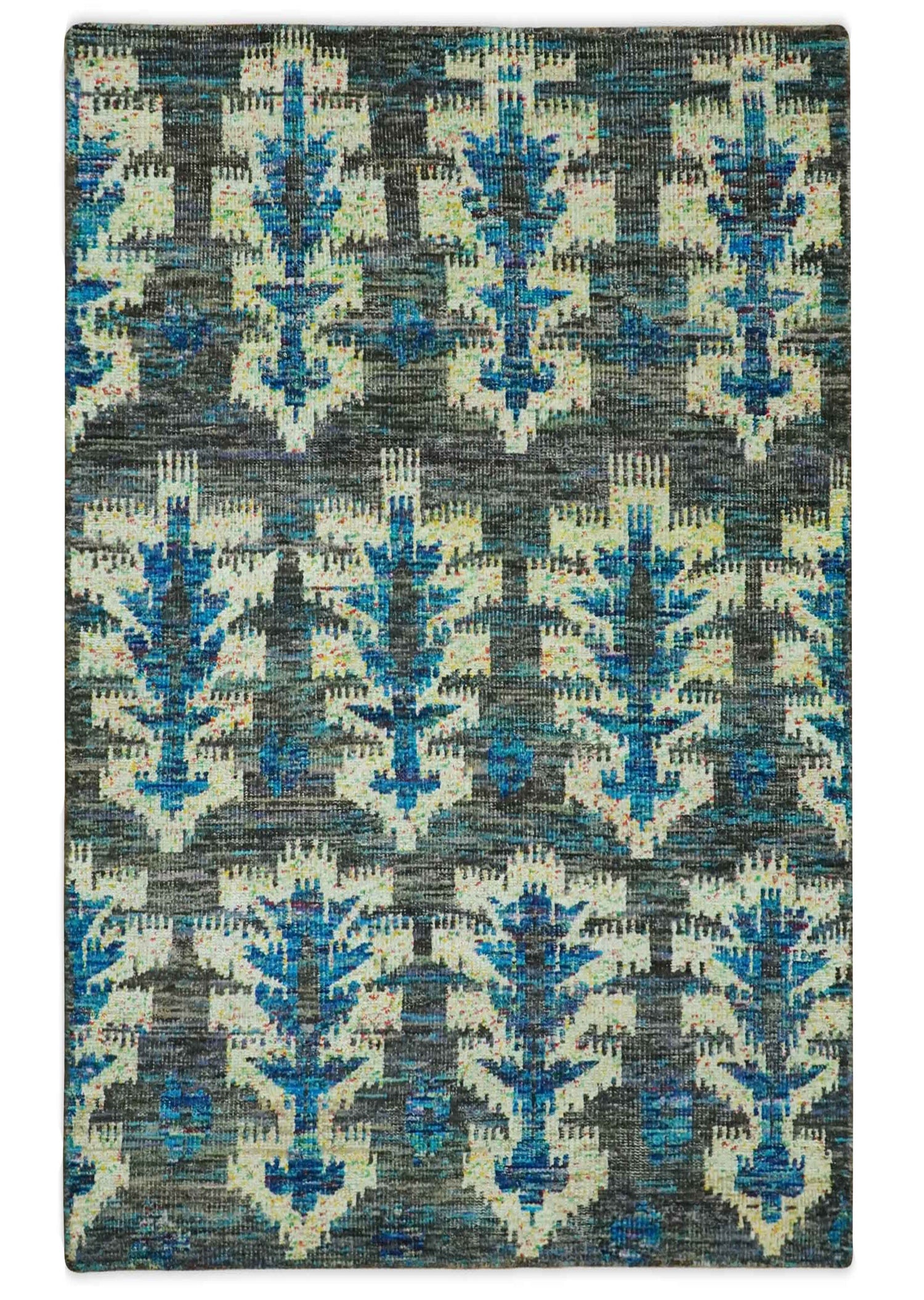5x8 Traditional Ikat design Charcoal, Blue and Beige Hand knotted wool area rug