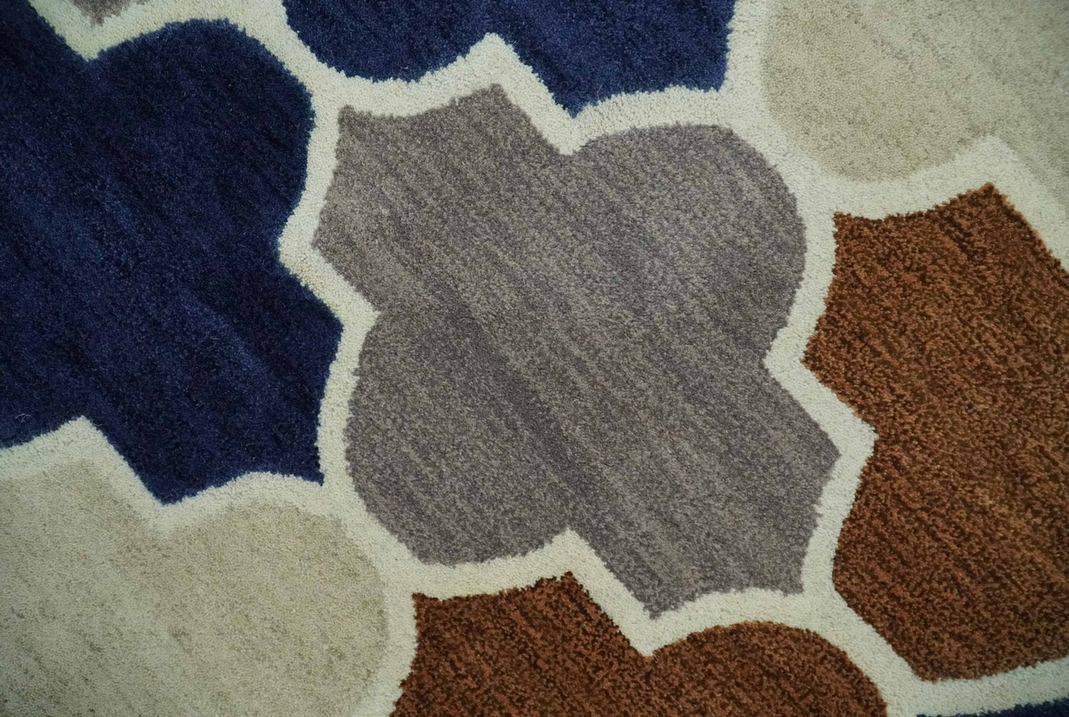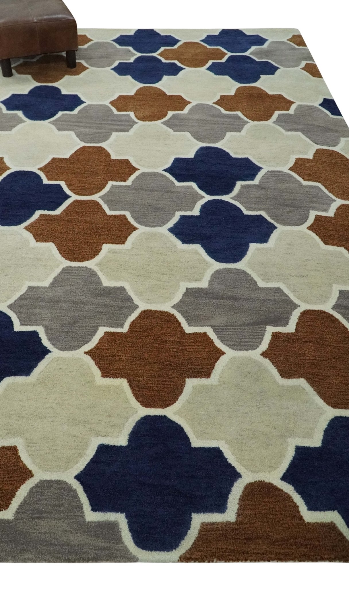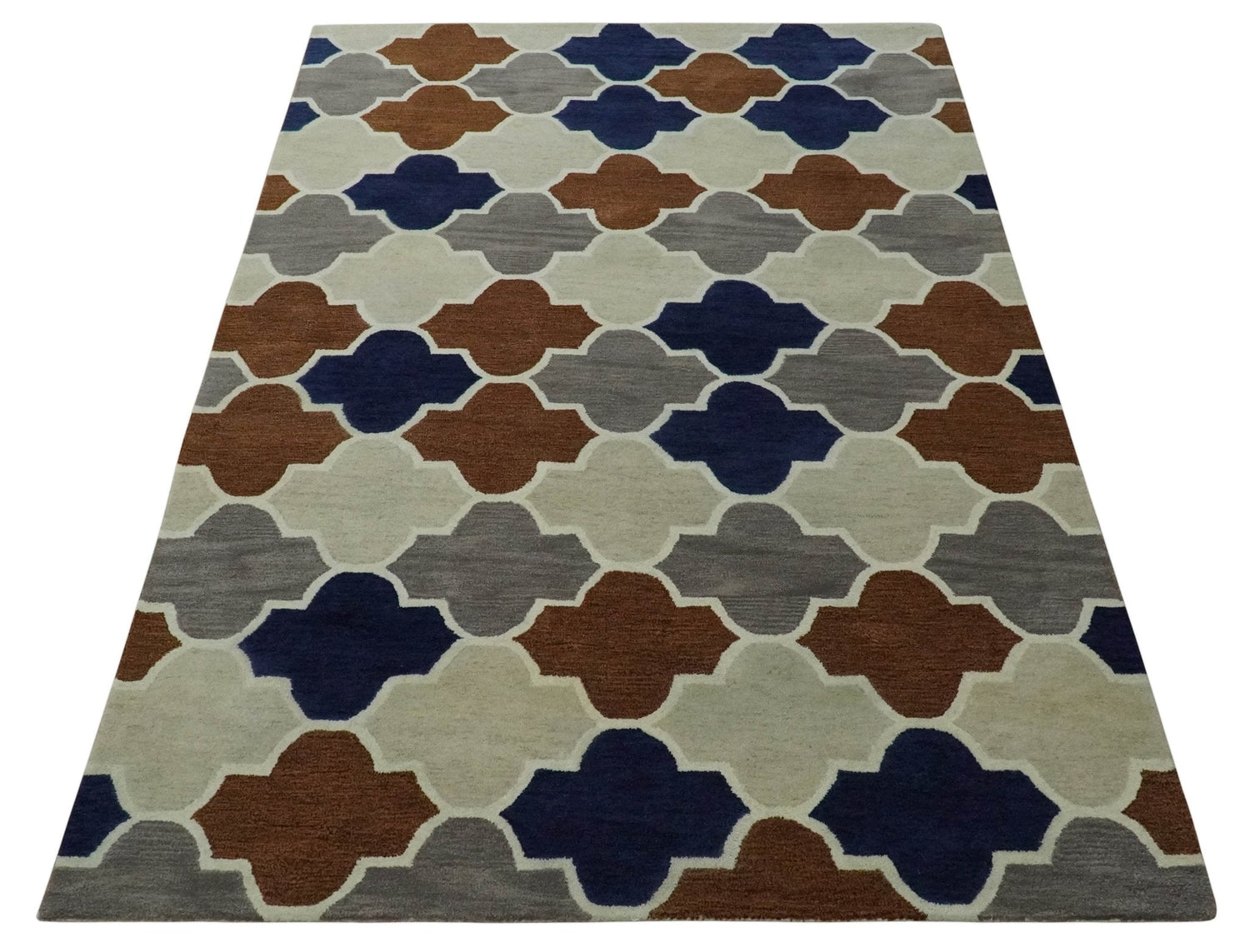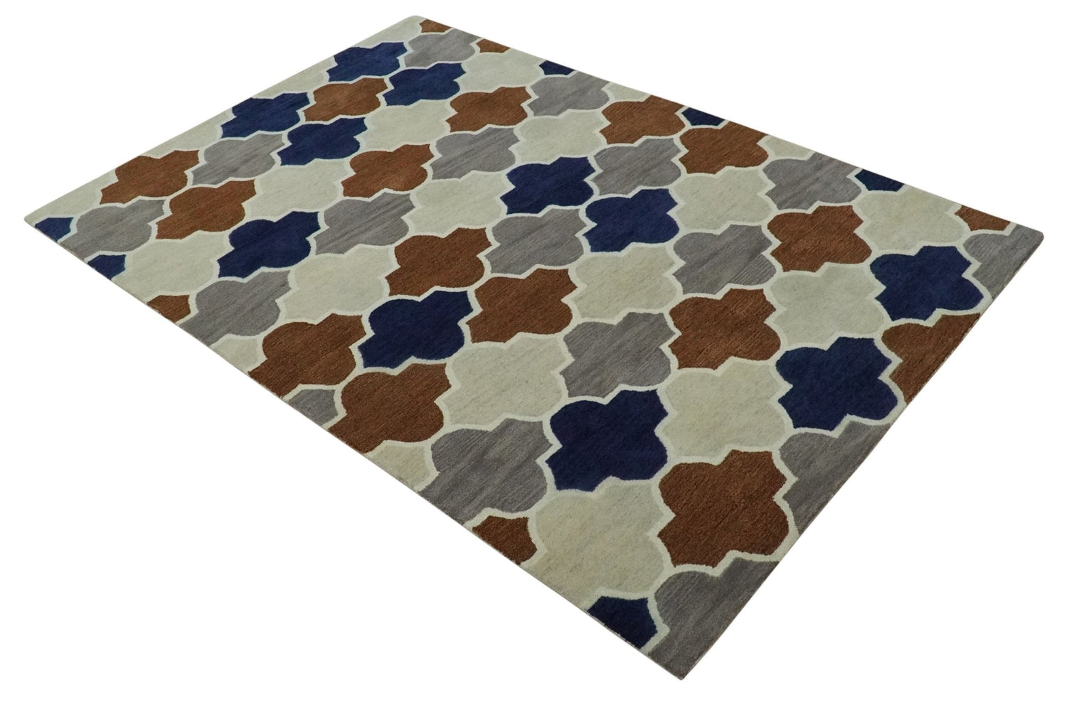 6x9 Ivory, Blue, Brown and Silver Ikat Pattern Hand Tufted Wool Area Rug