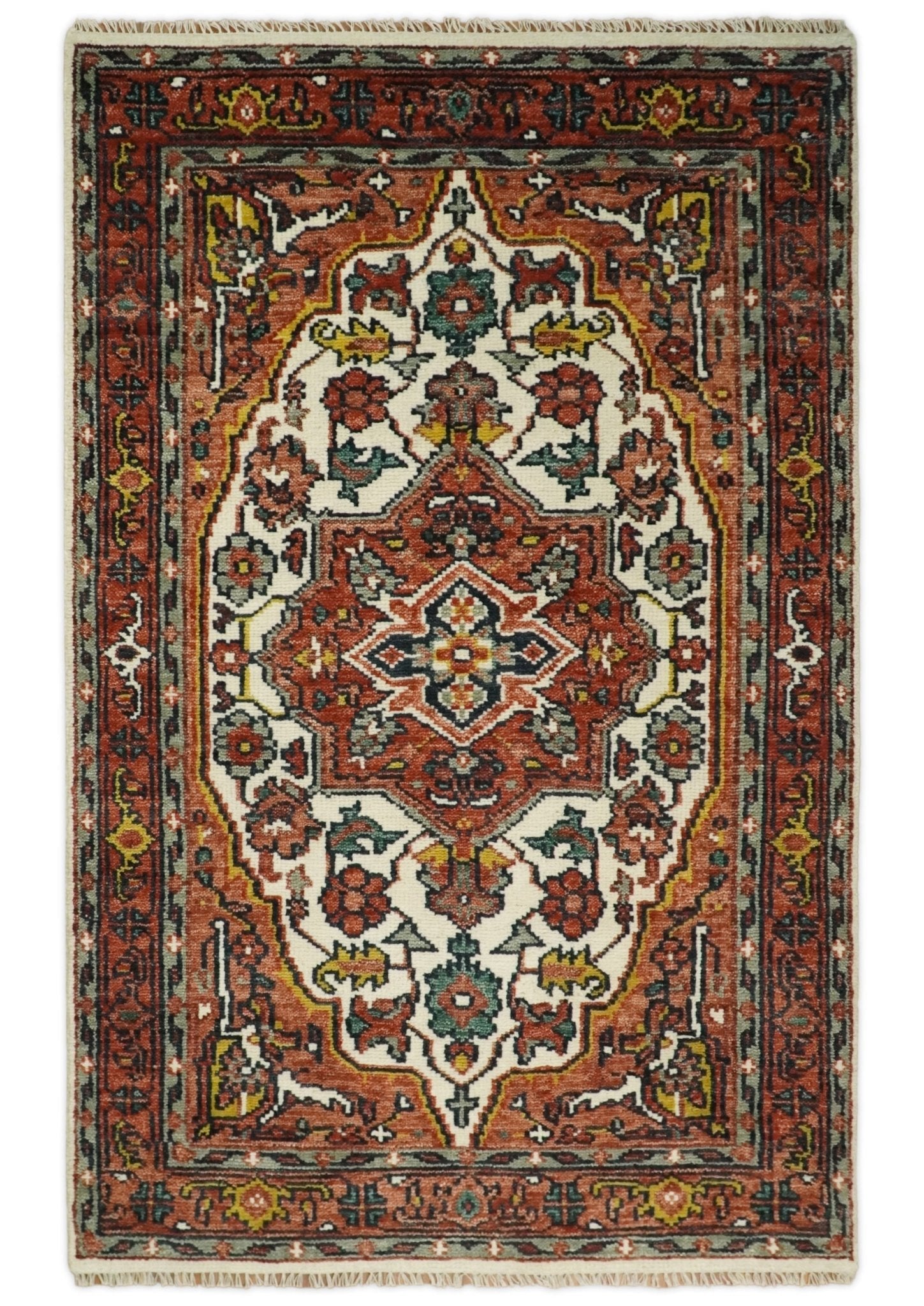 8x10, 9x12, 10x14 and 12x15 Hand Knotted Ivory and Rust Traditional Area Rug - 4x8 is backordered and will ship as soon as it is back in stock.