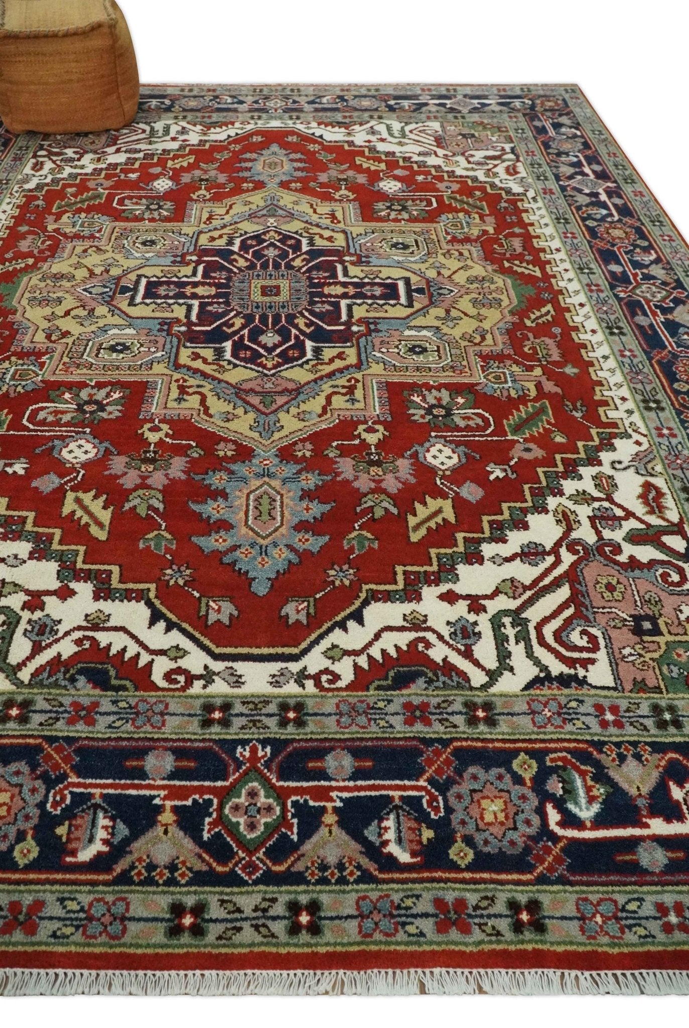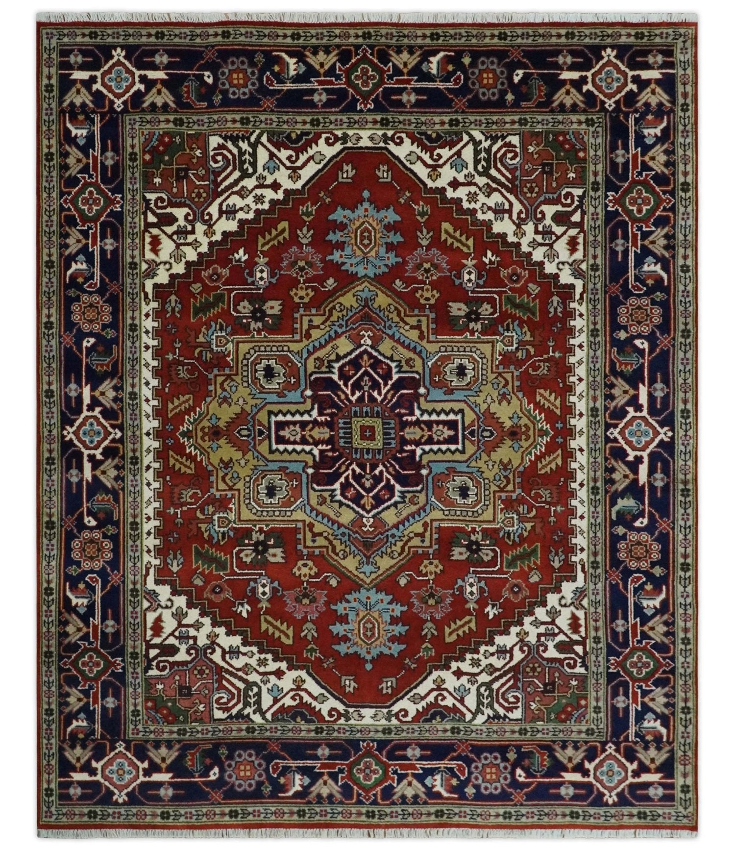8x10 and 9x12 Hand Knotted Brown, Mustard, Ivory and Blue Traditional Wool Area Rug