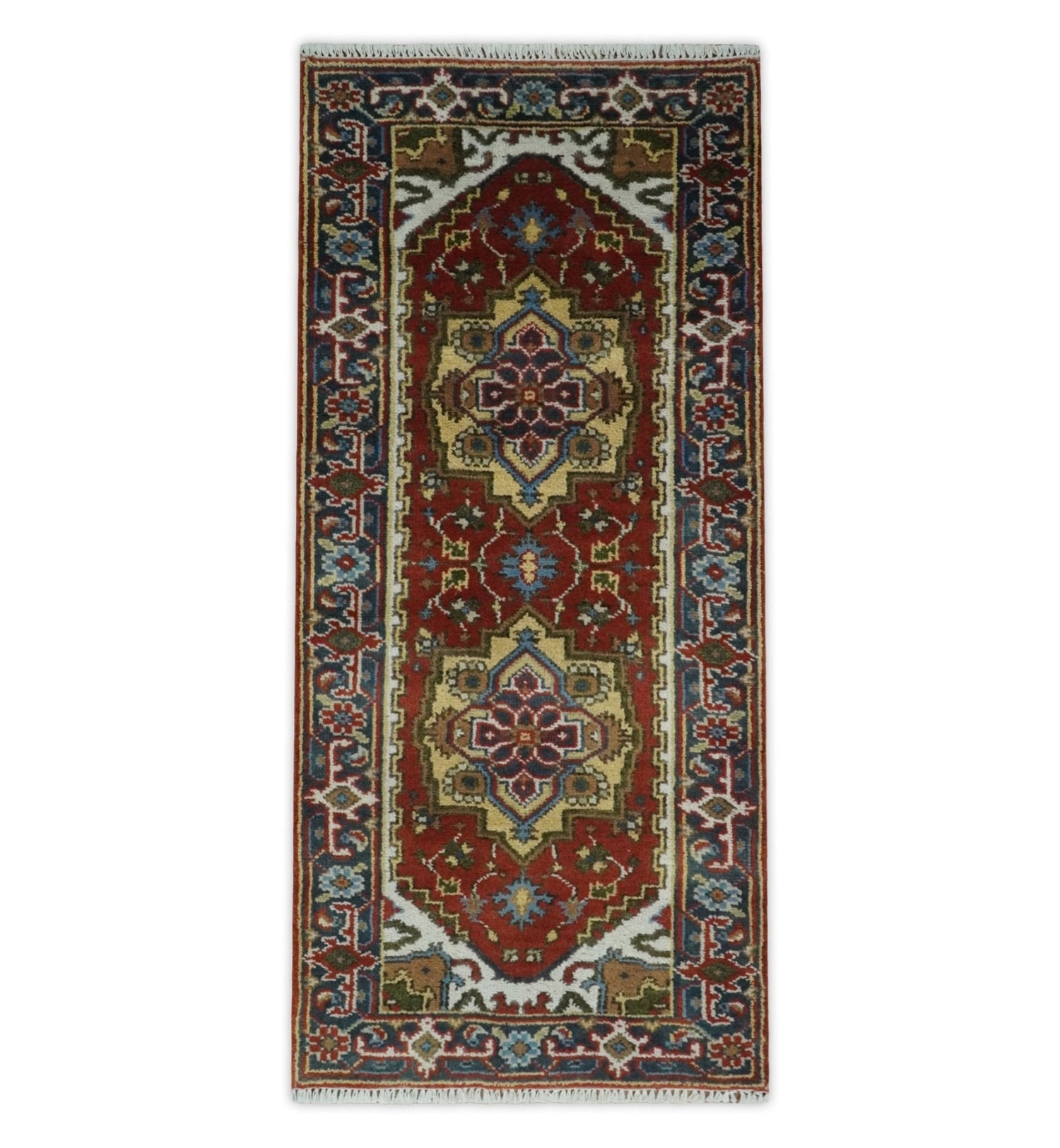 8x10 and 9x12 Hand Knotted Brown, Mustard, Ivory and Blue Traditional Wool Area Rug - 2.6x6 is backordered and will ship as soon as it is back in stock.
