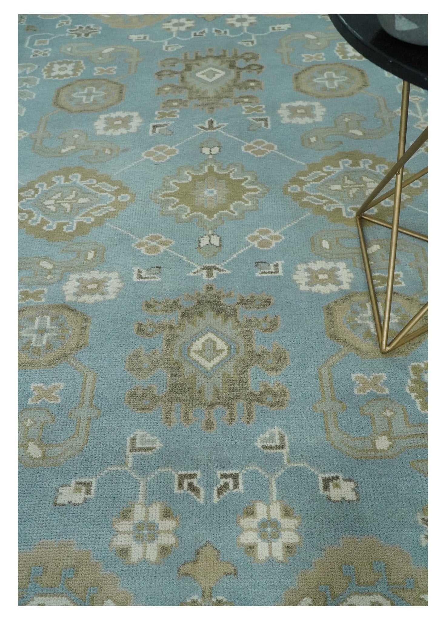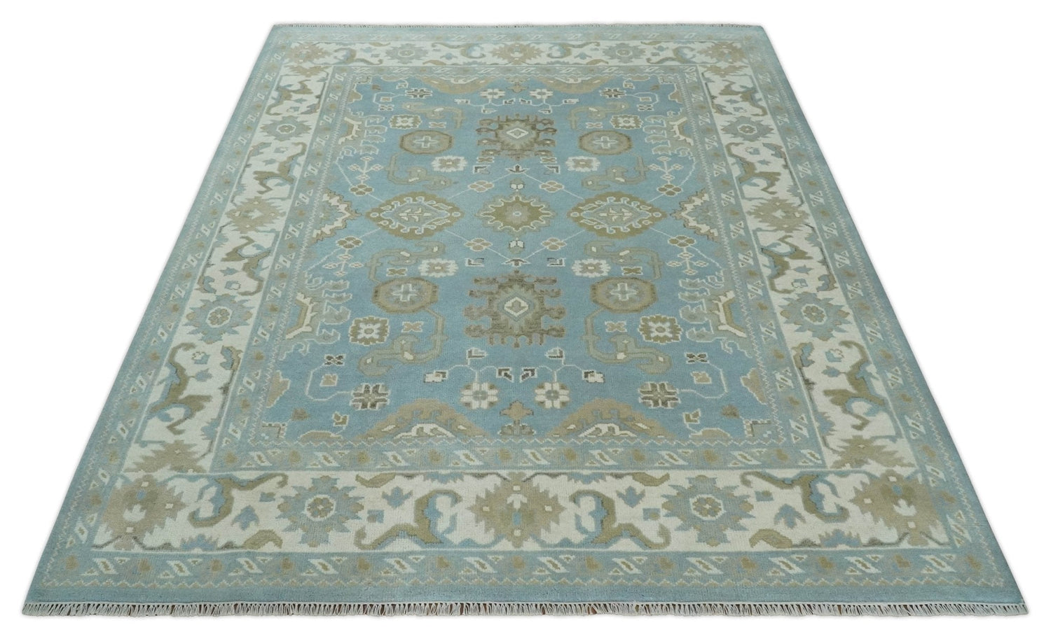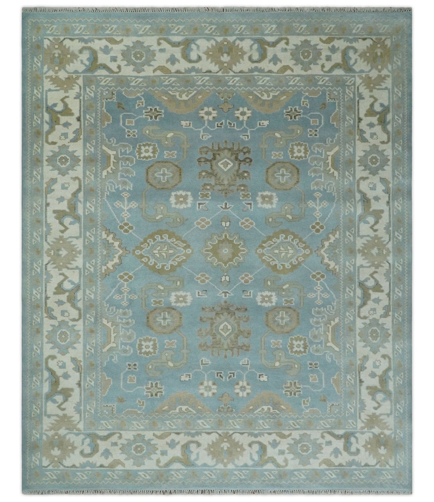 8x10 Aqua, Ivory and Olive Traditional Oushak Hand Knotted Wool Area Rug