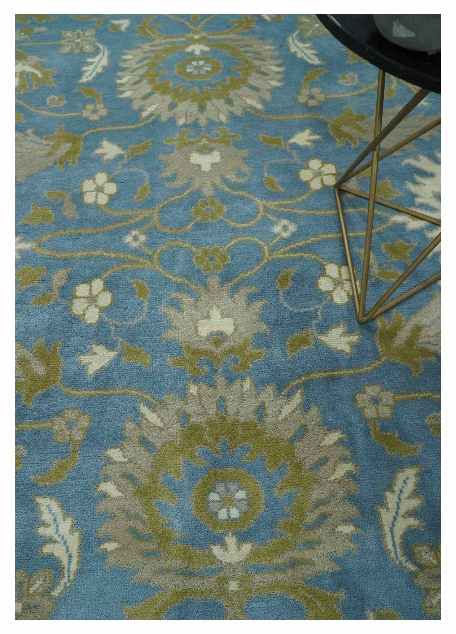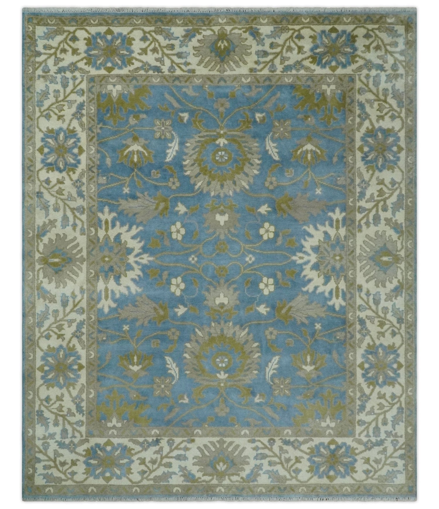 8x10 Blue, Ivory and Olive Hand Knotted Heriz Serapi Floral Area Rug | TRDCP1181810