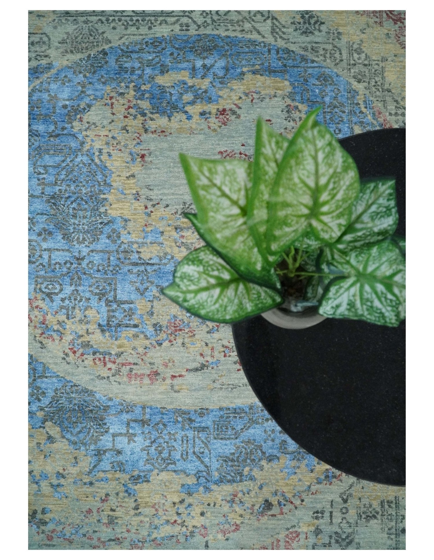 8x10 Fine Hand Knotted Beige and Blue Modern Abstract Style Antique Wool and Silk Area Rug | AGR37