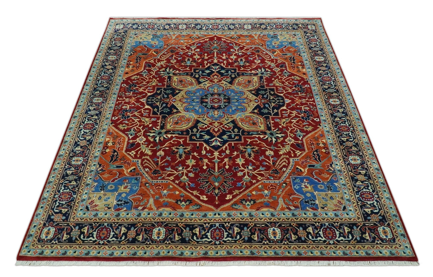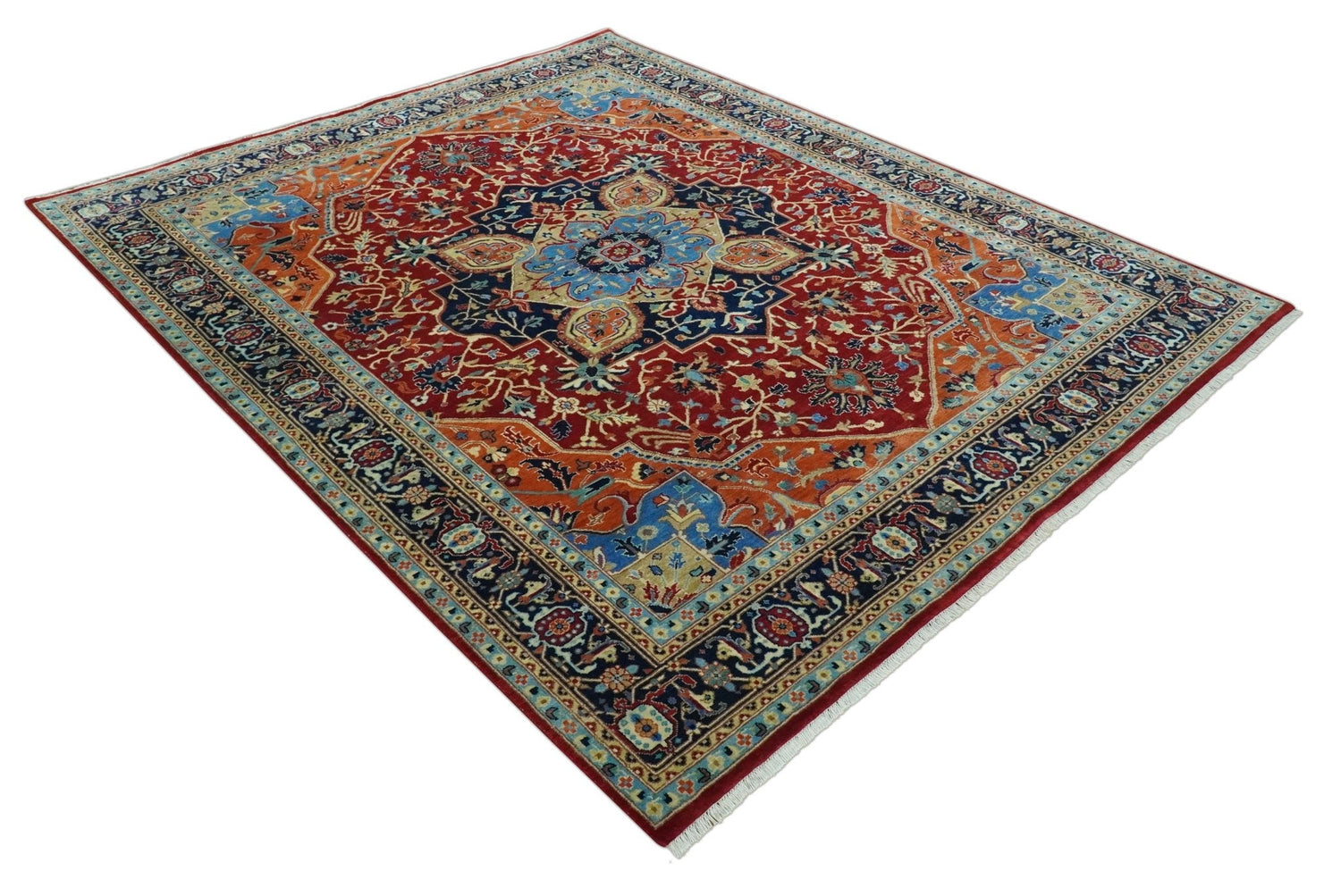 8x10 Fine Hand Knotted Rust and Blue Traditional Heriz Medallion wool area rug