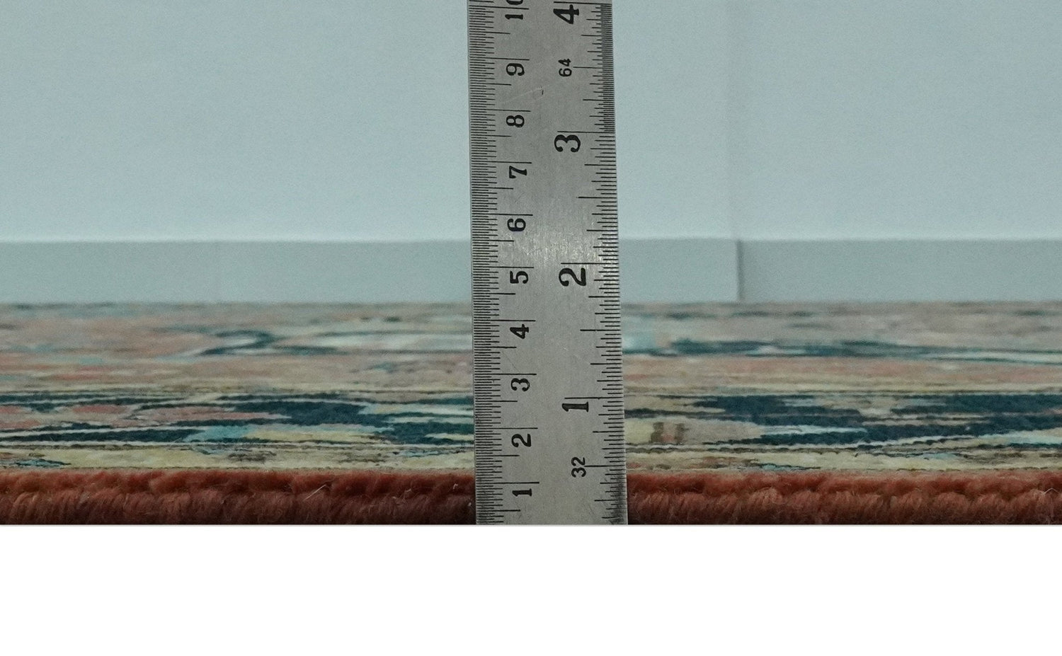 Expertly handcrafted with a traditional design, this 8x10 wool area rug boasts a stunning color combination of rust, teal, and dark blue. Each knot is carefully tied for a fine finish, ensuring lasting quality. Elevate your space with this luxurious and timeless piece.