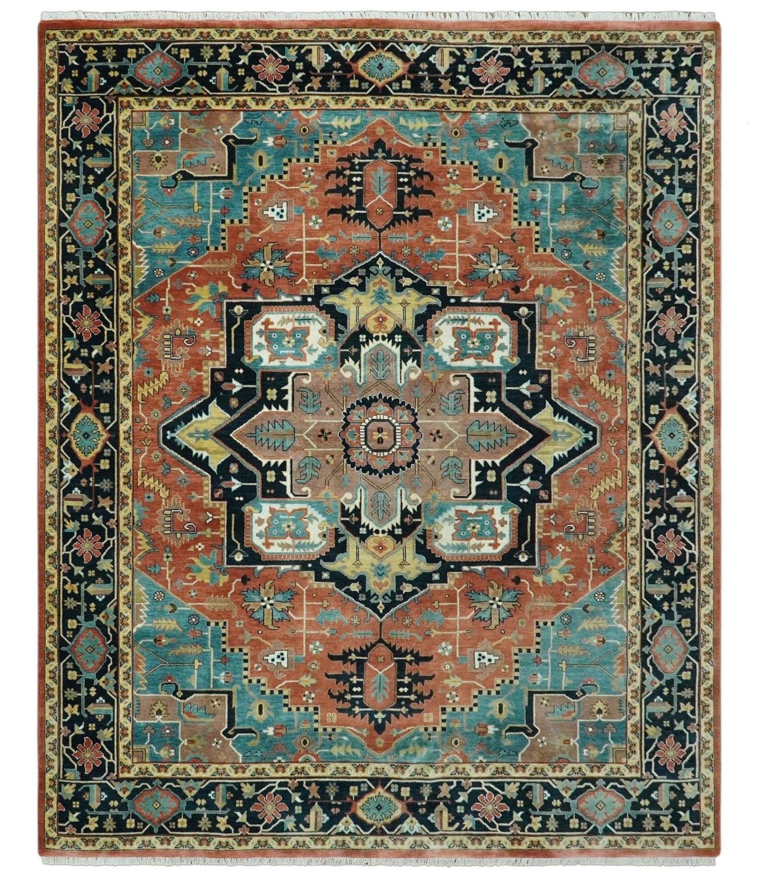 8x10 Fine Hand Knotted Rust, Teal and Dark Blue Traditional Heriz wool area rug - 8x10 is backordered and will ship as soon as it is back in stock.
