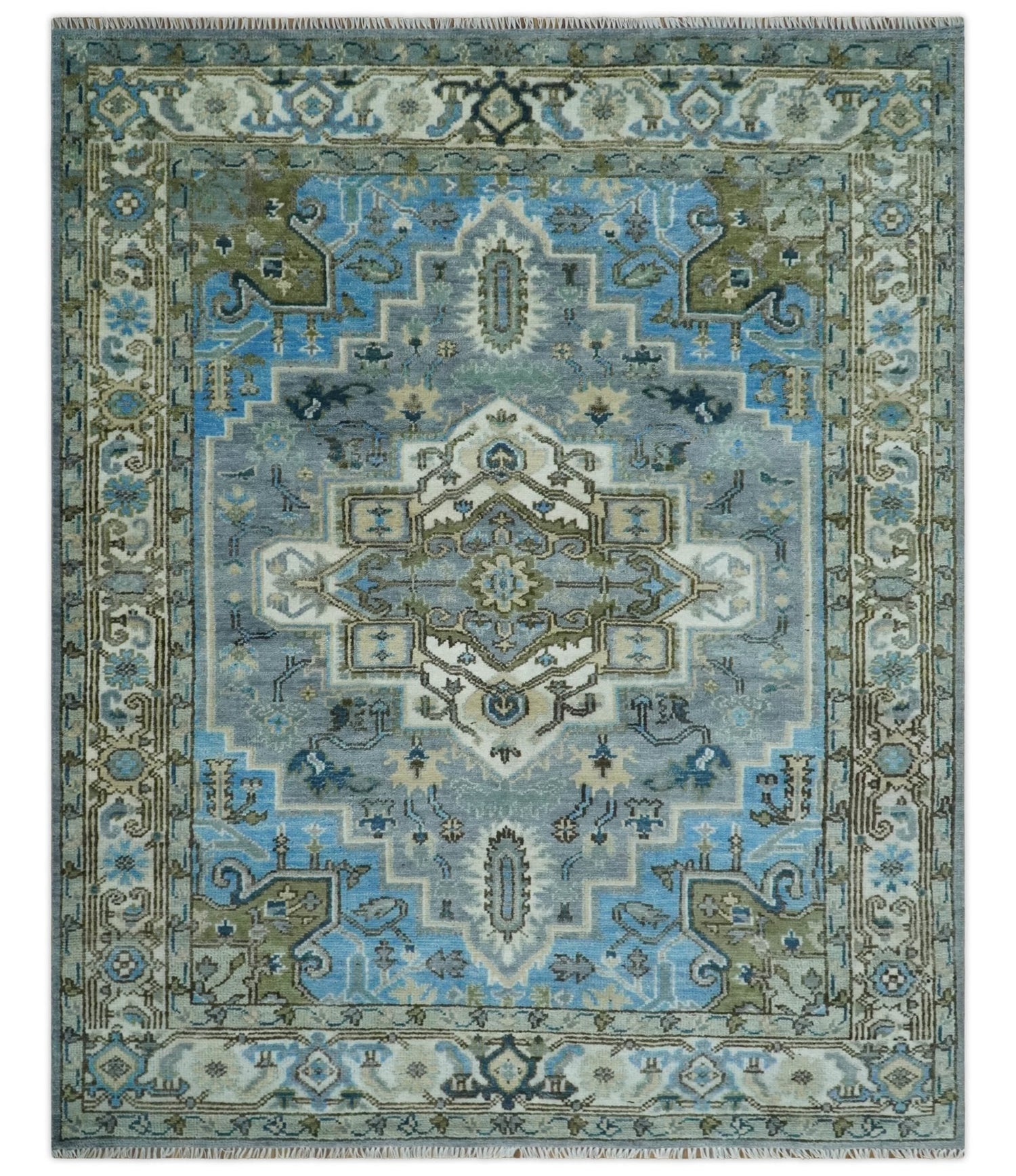 8x10 Gray, Ivory, Moss Green and Blue Hand Knotted Traditional Heriz Wool Area Rug - 8x10 is backordered and will ship as soon as it is back in stock.