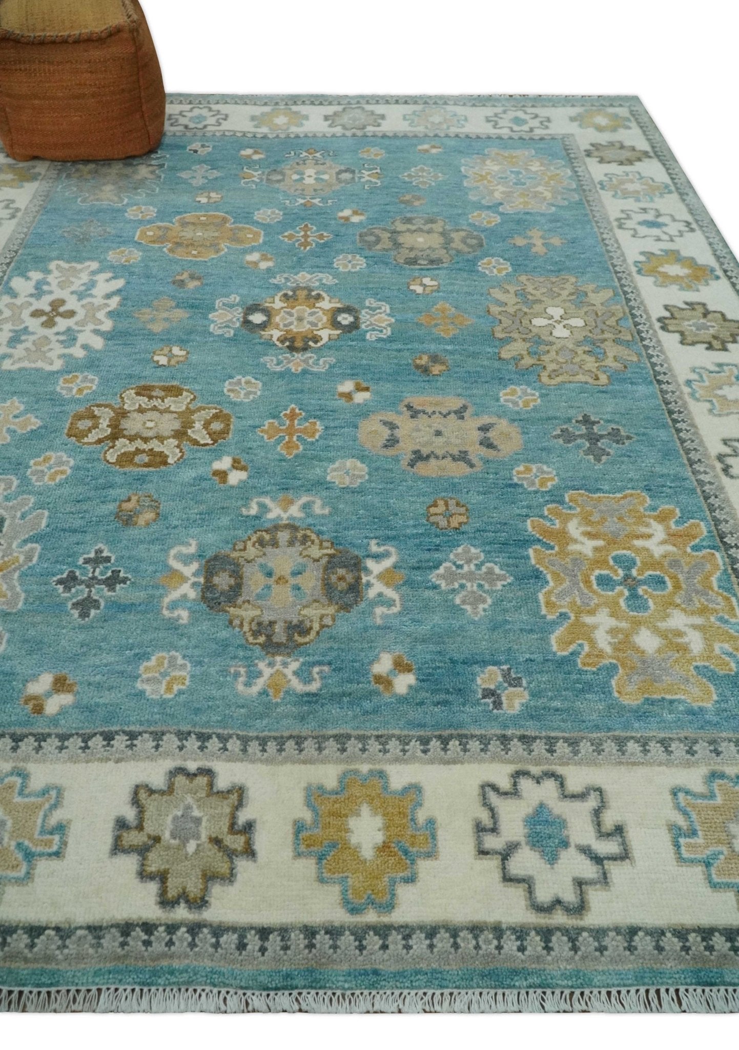 8x10 Hand Knotted Aqua and Ivory Traditional Oushak Wool Area Rug