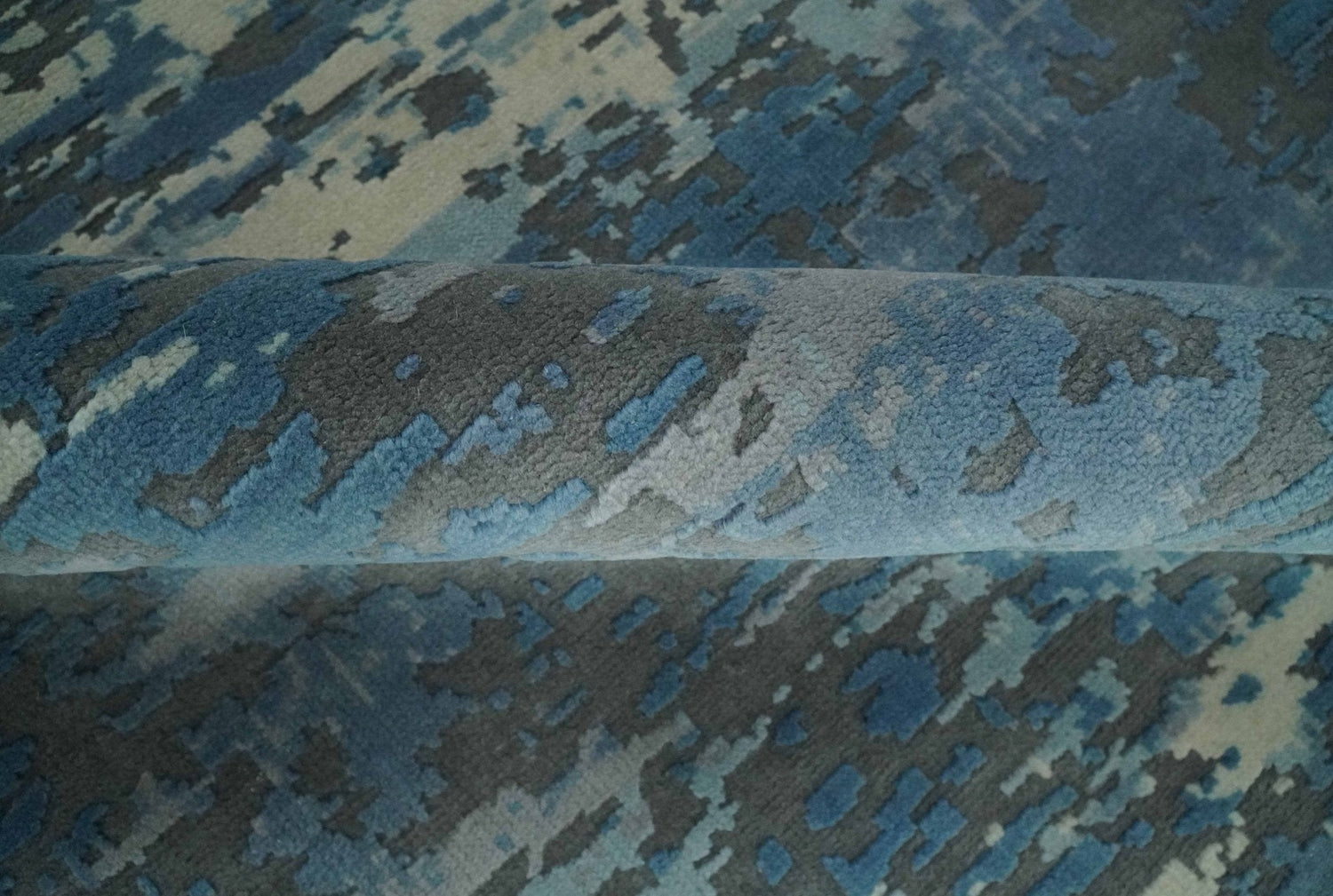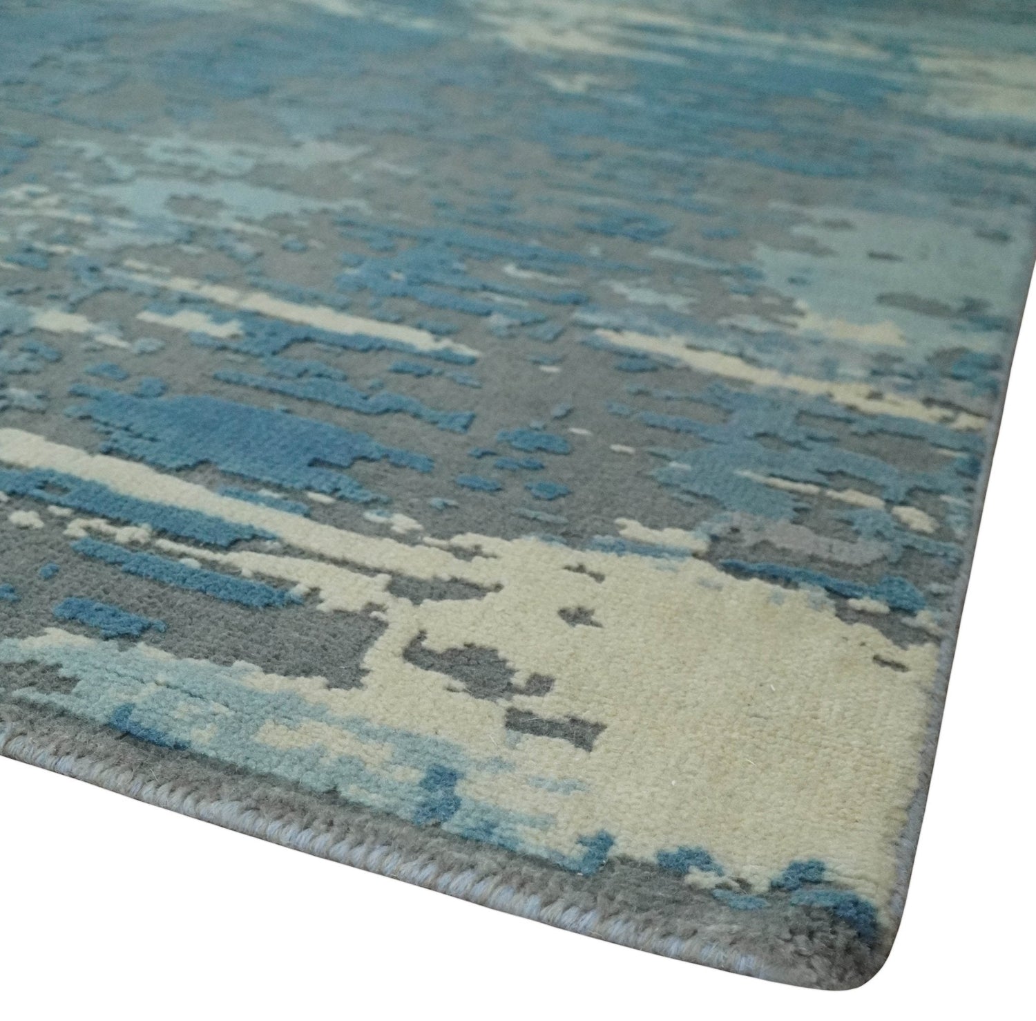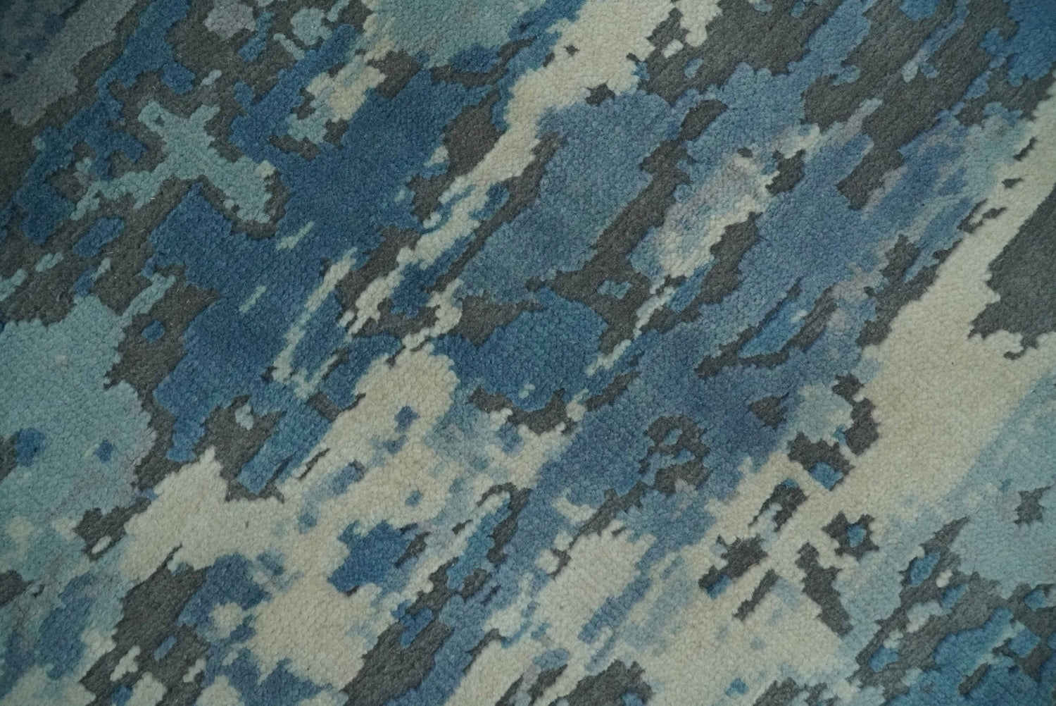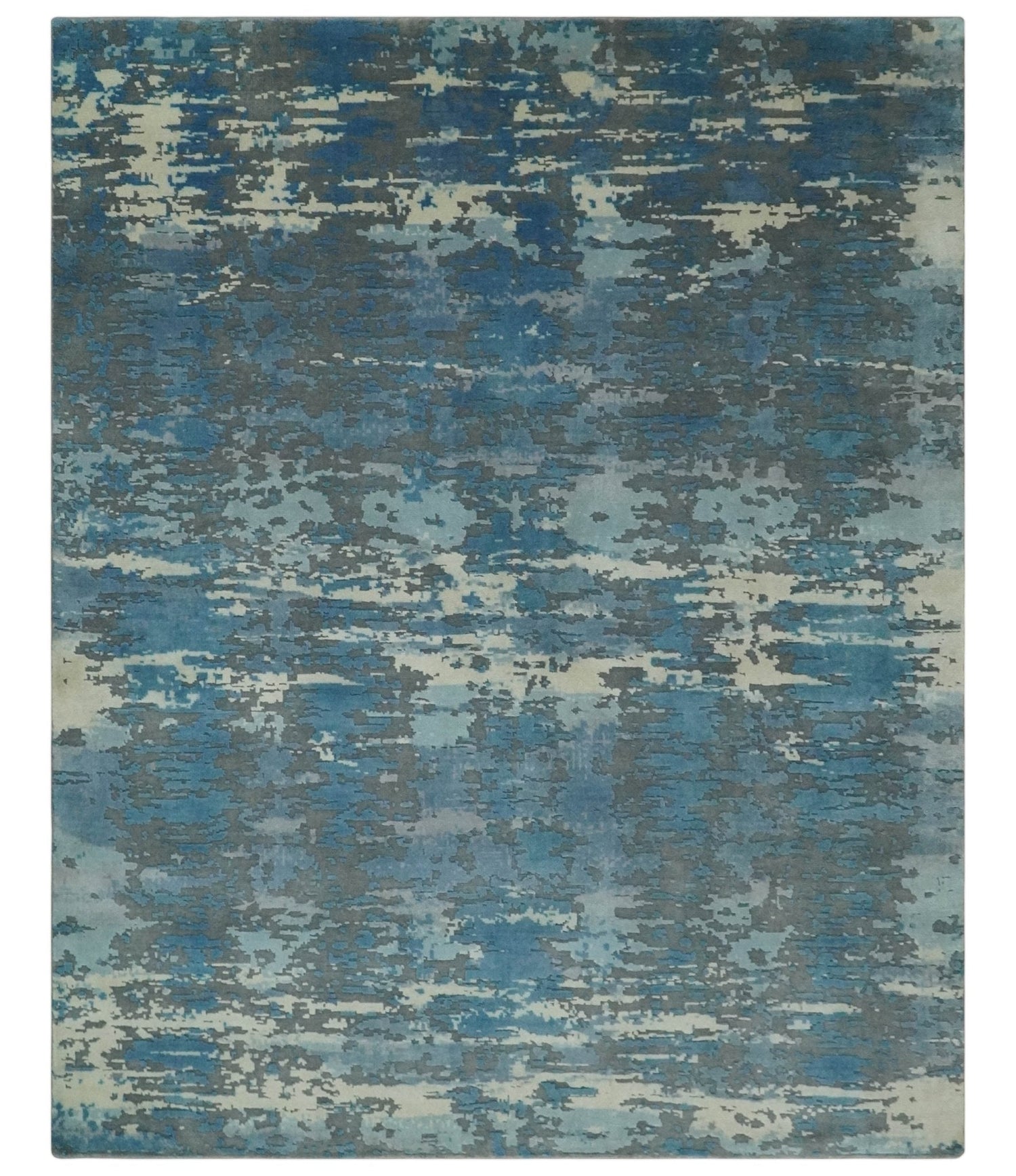 8x10 Hand Knotted Blue, Ivory and Charcoal Abstract Wool Area Rug