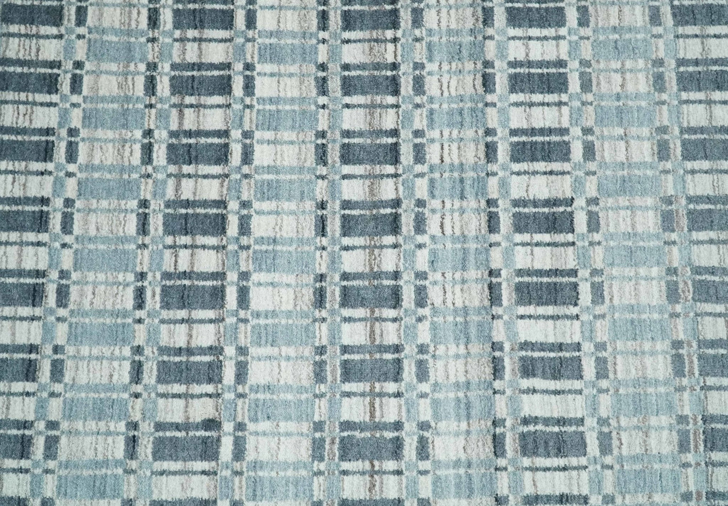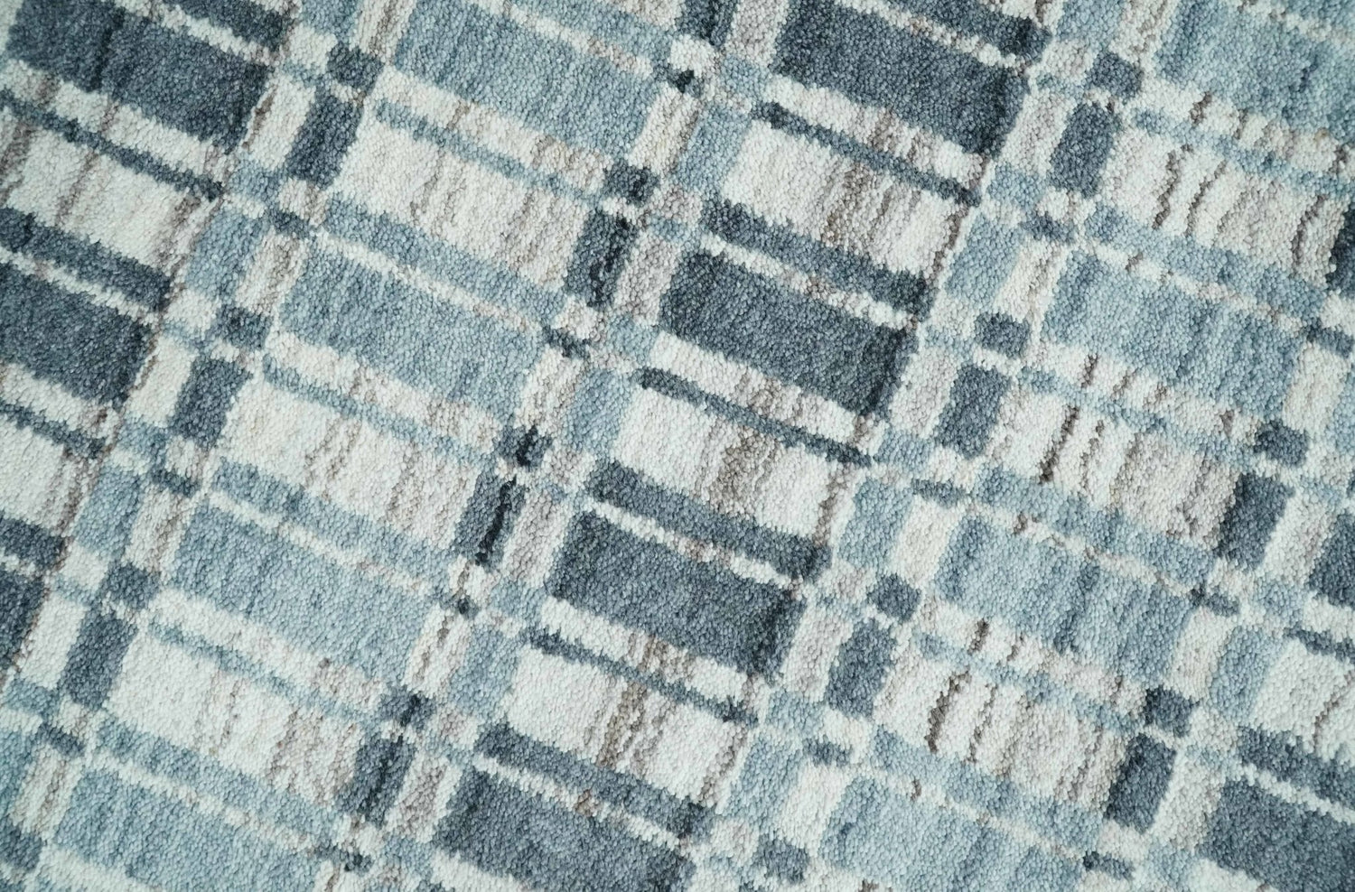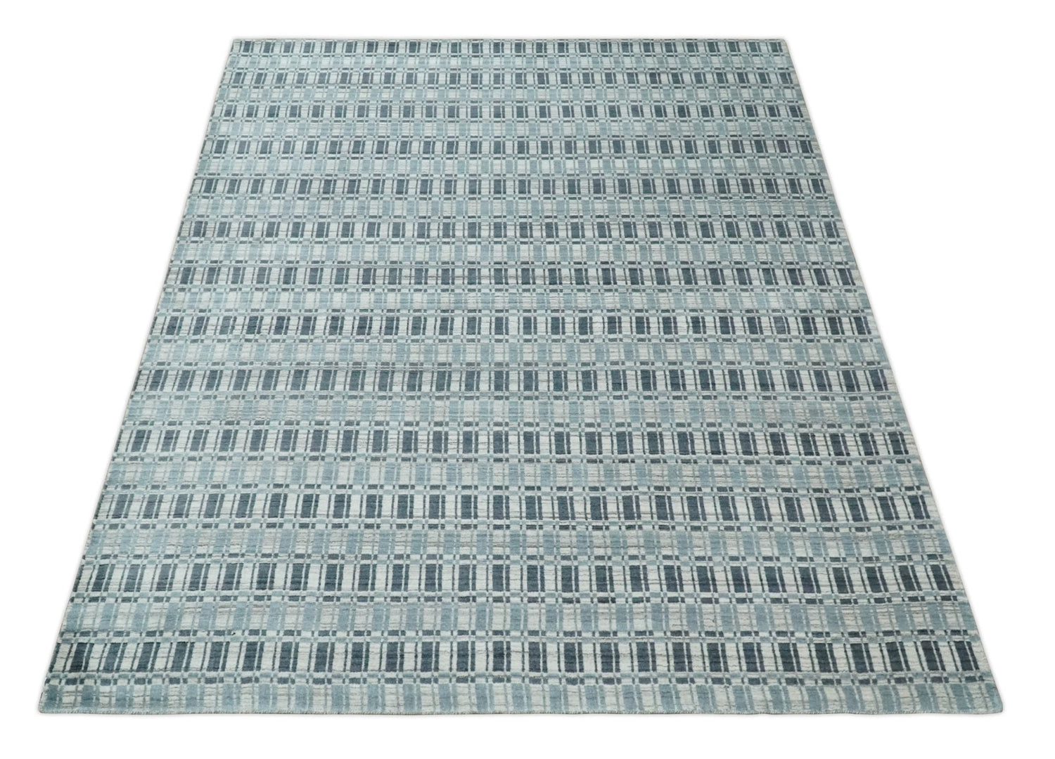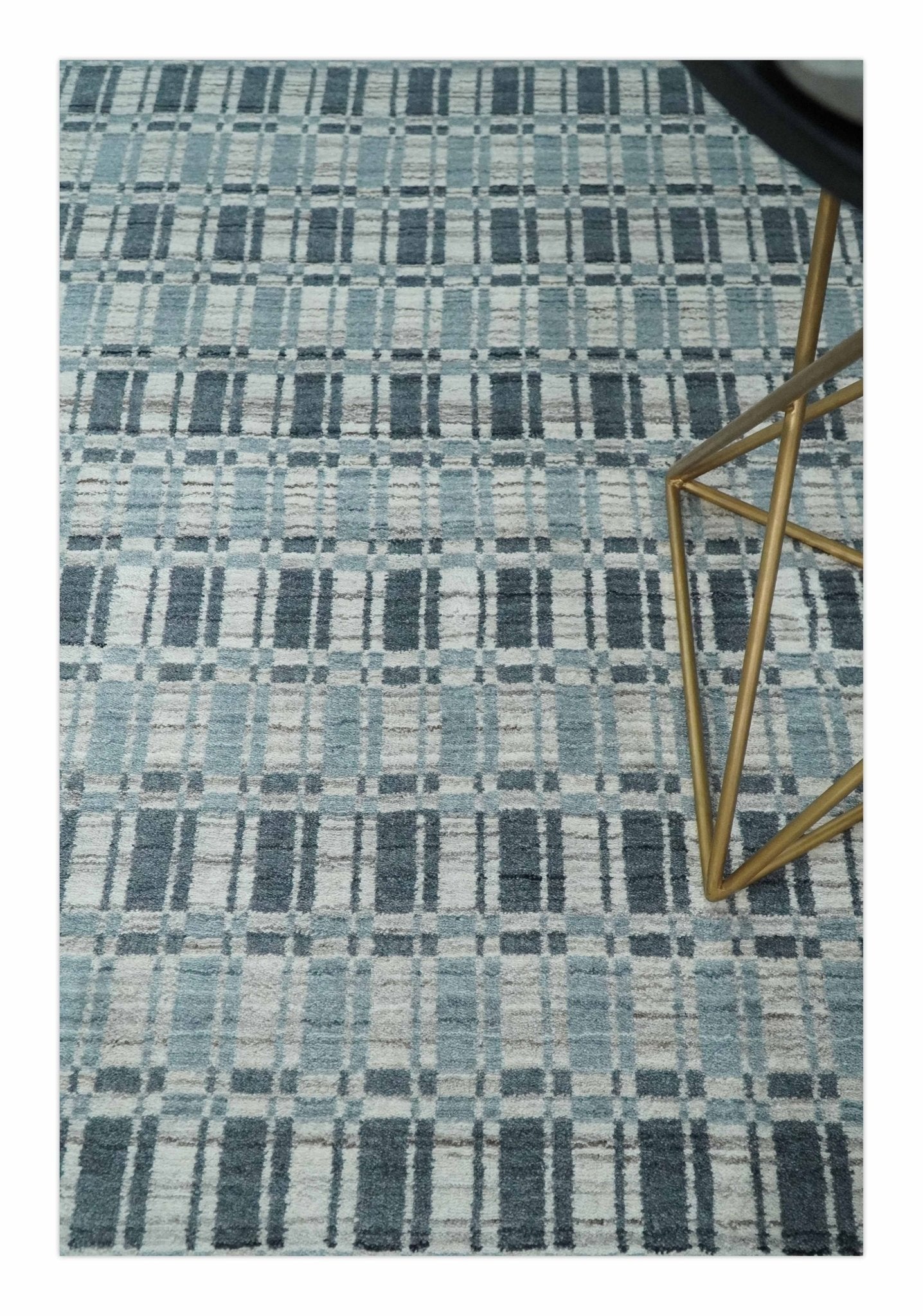 8x10 Hand Made Checkered Beige, Blue and Charcoal Scandinavian Blended Wool Flatwoven Area Rug | KE30