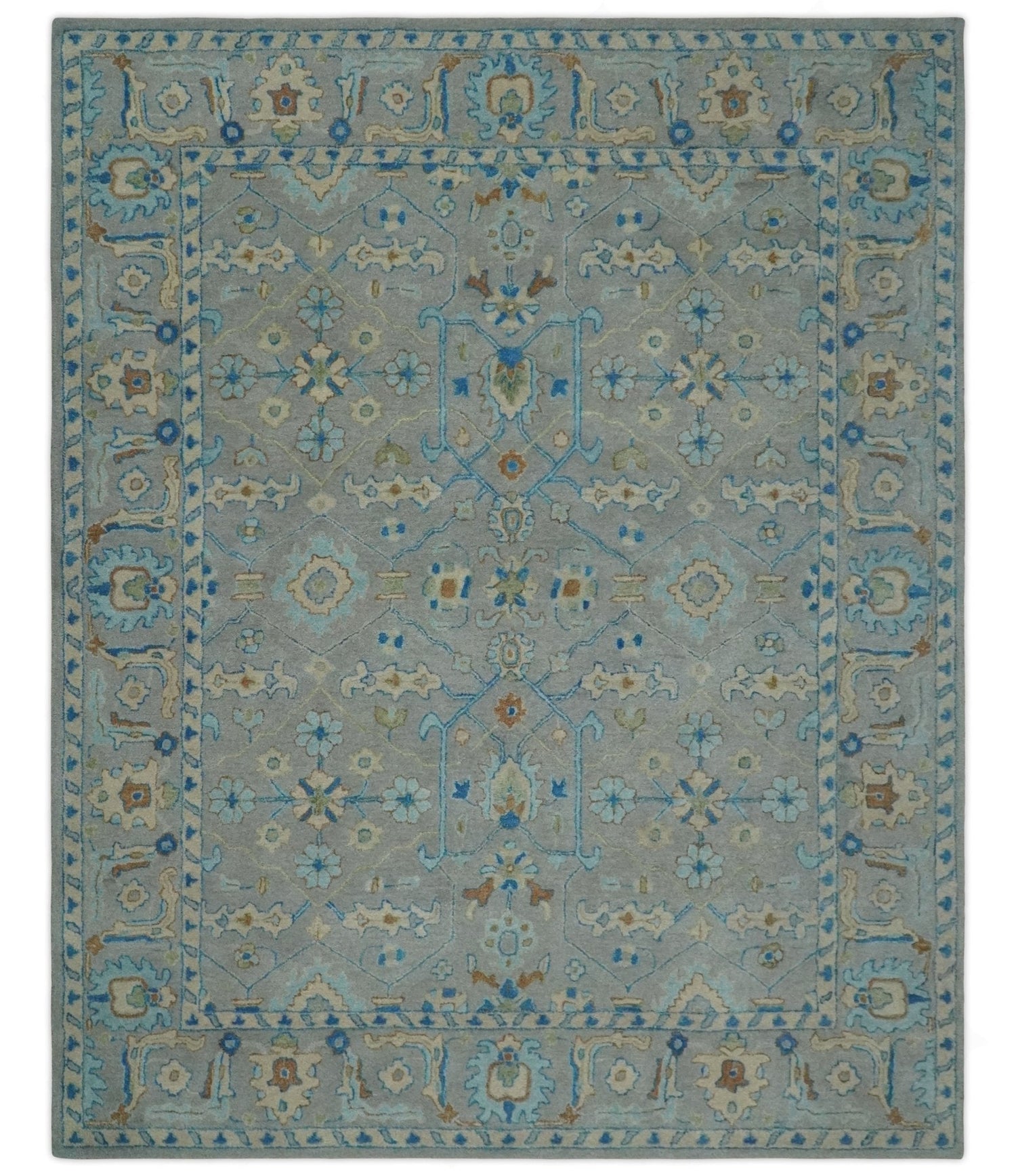 8x10 Hand Tufted Gray, Beige and Accent Blue Traditional Herati Design Wool Rug