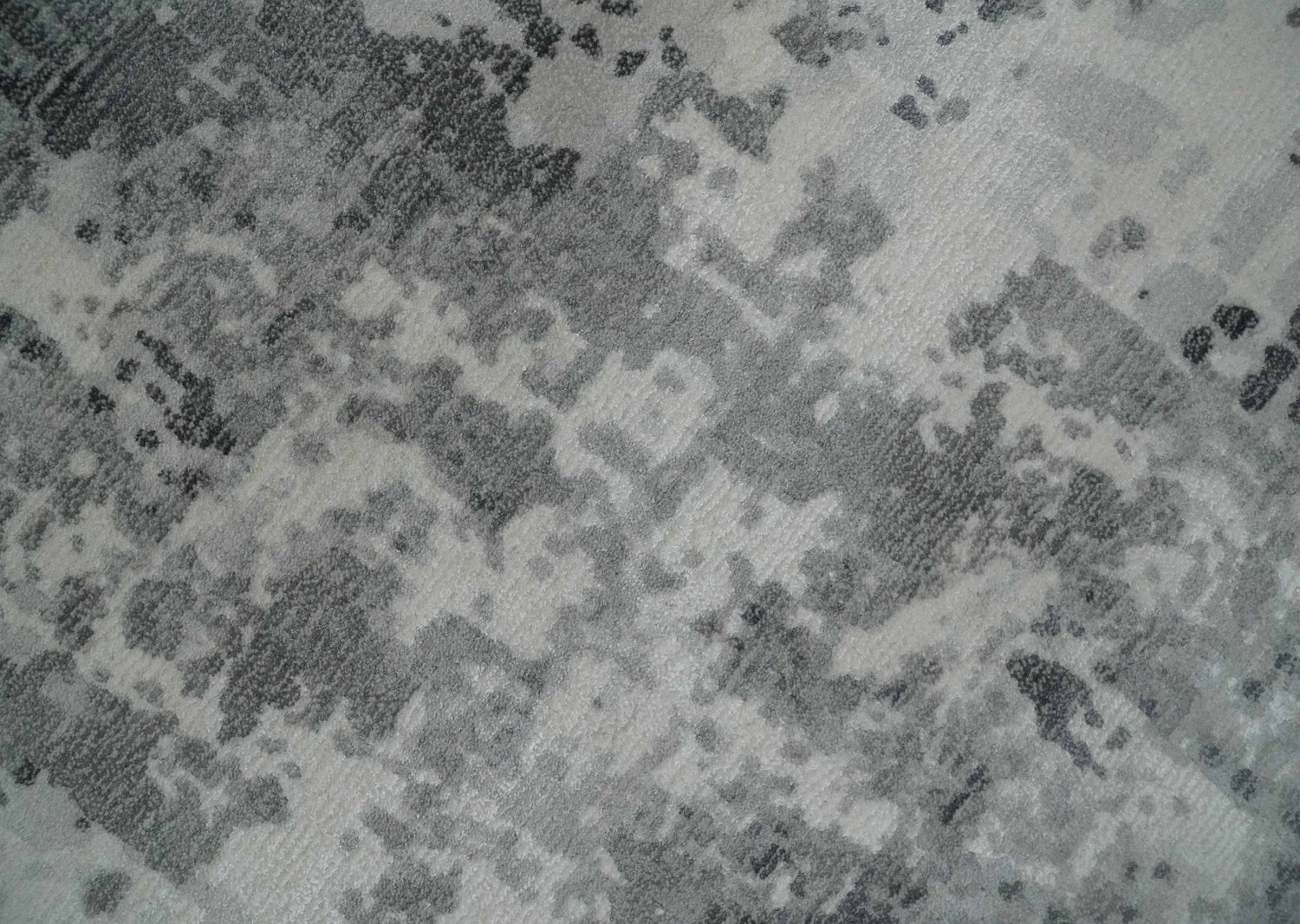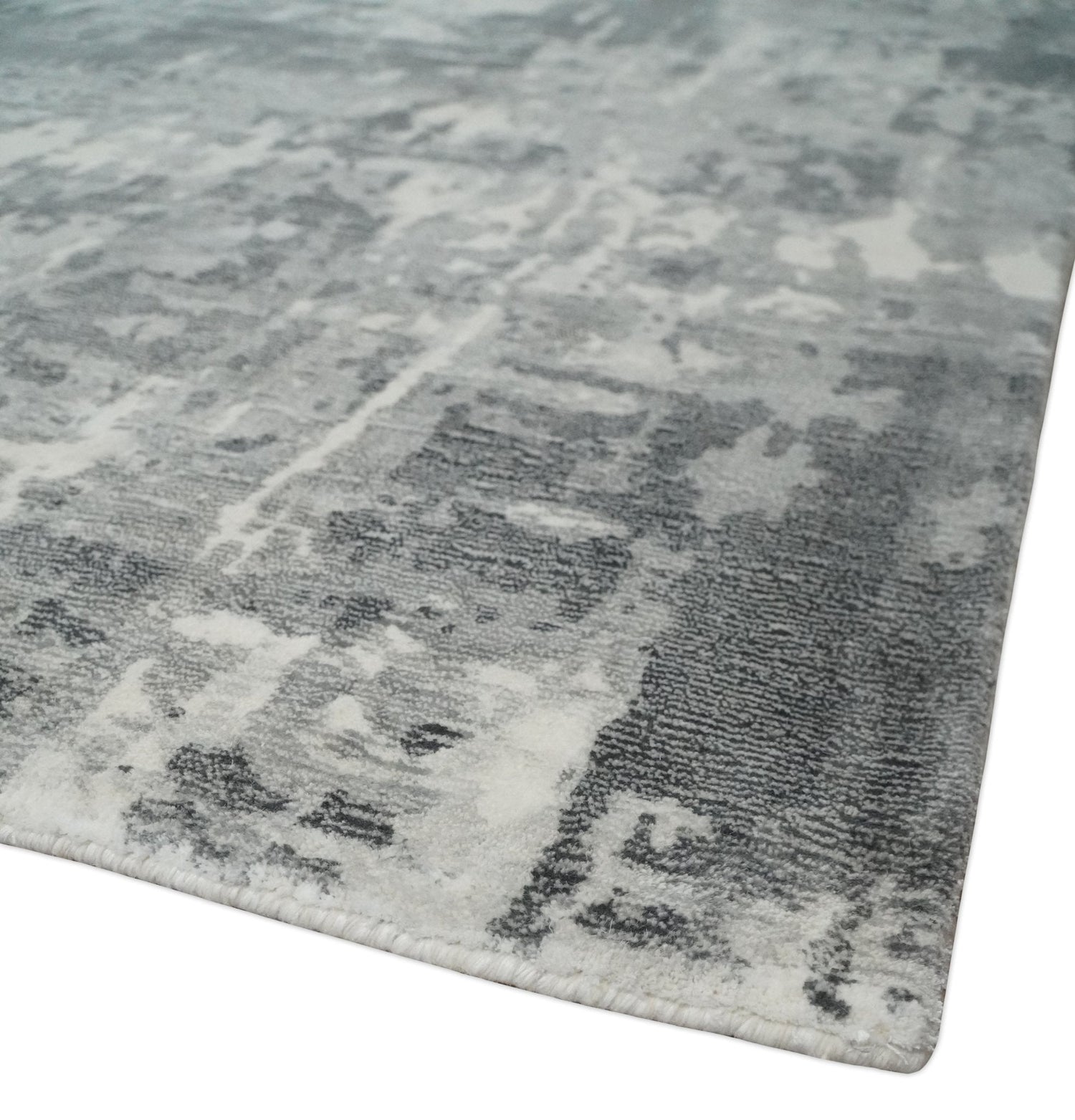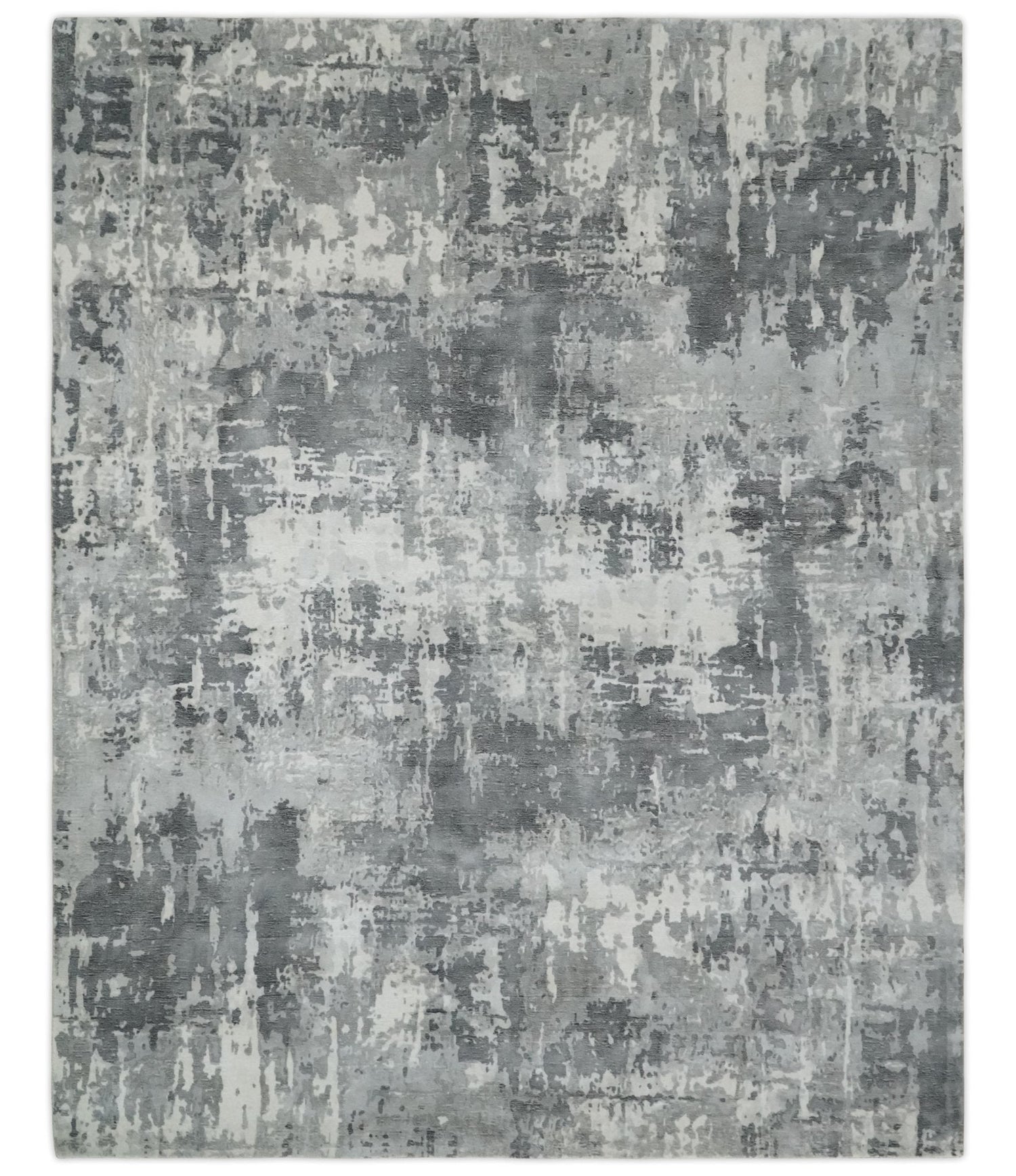 8x10 Ivory, Silver and Charcoal Modern Abstract Hand Loomed Blended wool and Art silk Area Rug