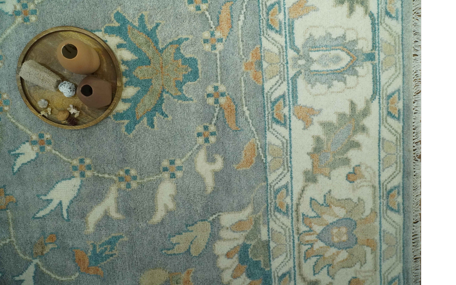 8x10 Traditional Floral Silver and Ivory Hand Knotted wool area rug - 8x10 is backordered and will ship as soon as it is back in stock.