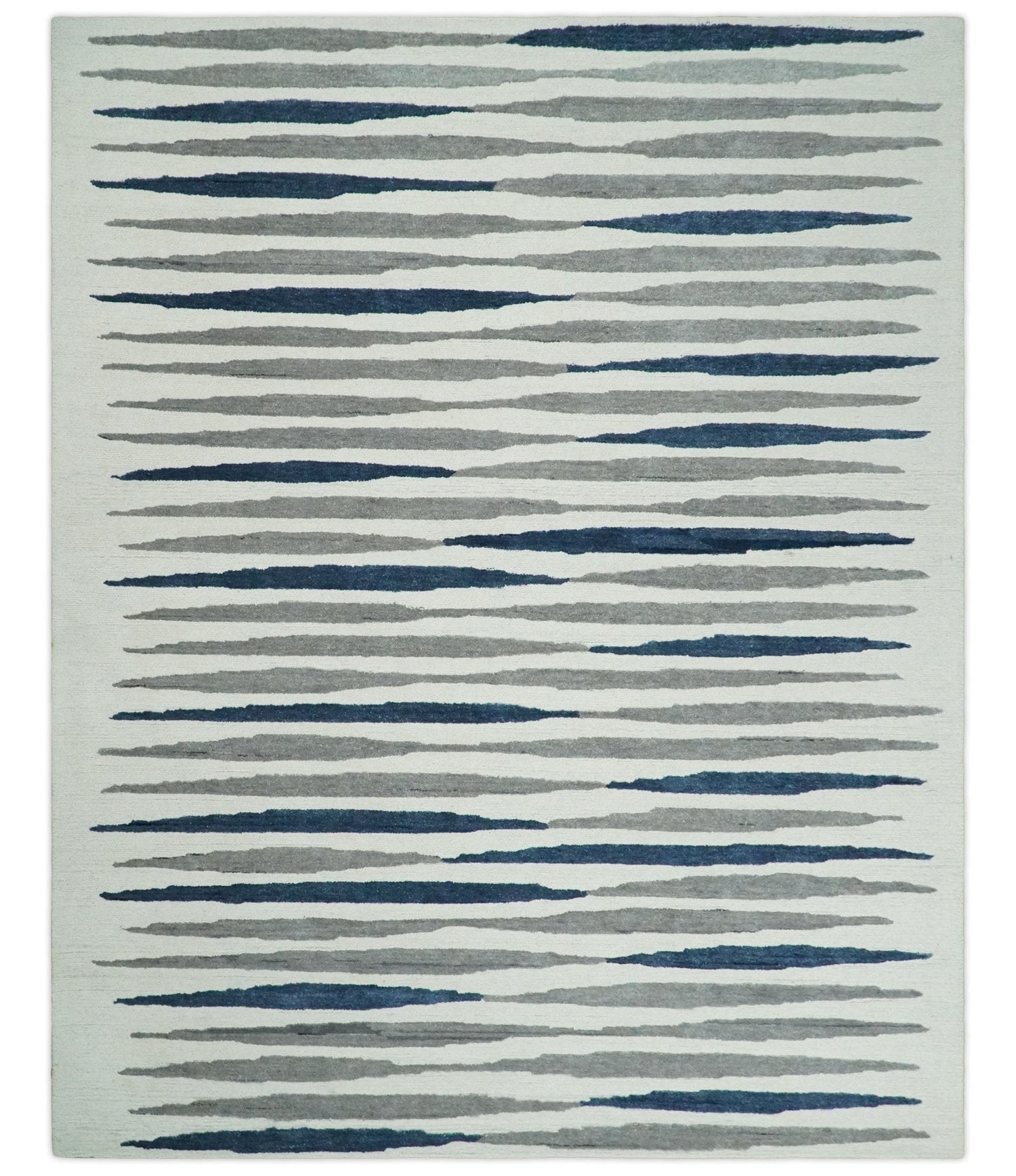 8x10 White, Blue and Camel Hand Tufted Modern Scandinavian Stripe Wool Area Rug | YUK3