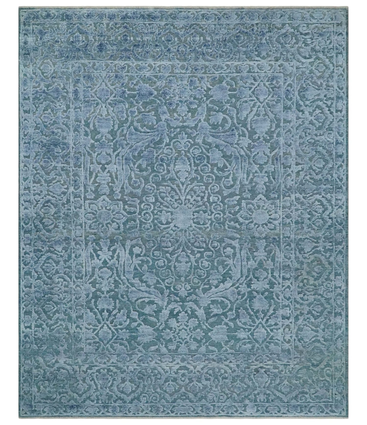 8x9.7 Blue Antique Style, Distressed Finish Hand Carved Traditional Medalian Hand Knotted Wool and Silk Rug