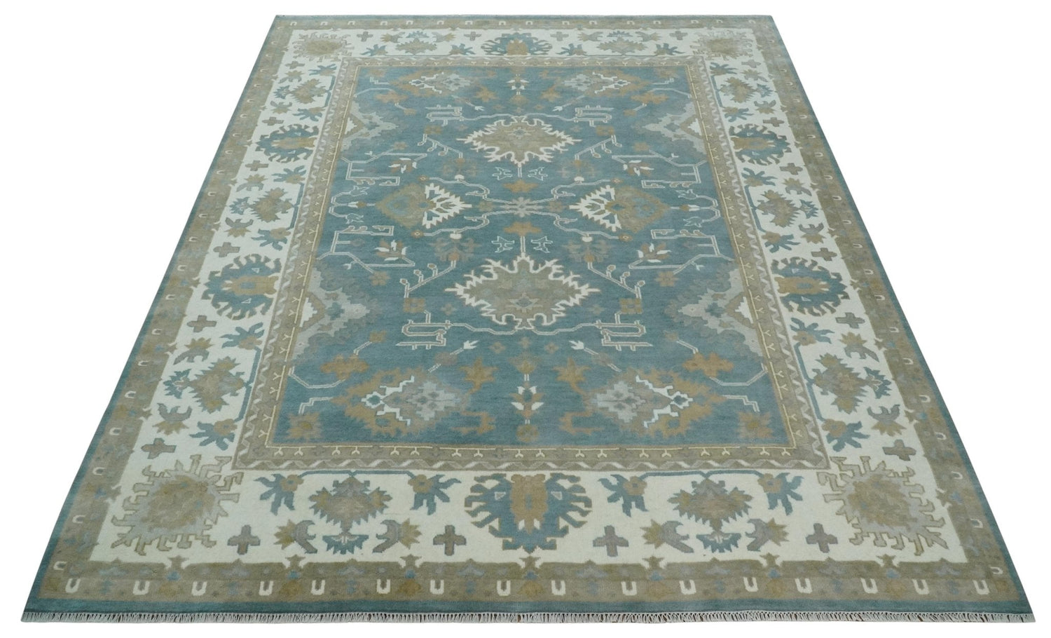 9.2x11.9 Hand Knotted Blue and Ivory Traditional Oushak Wool Area Rug