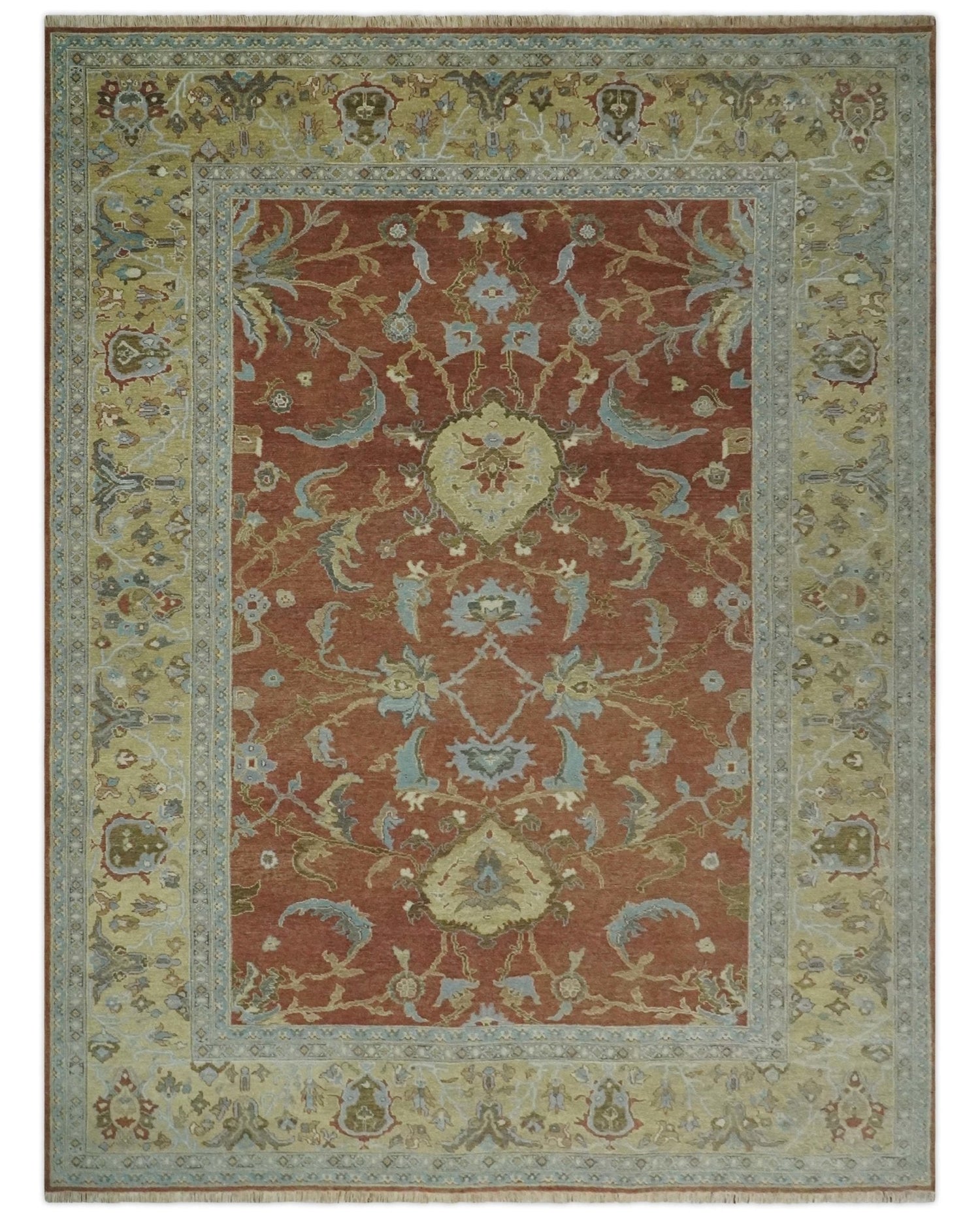 9.4x11.9 Hand Knotted Low Pile Rust, Beige and Blue Traditional Wool Area Rug