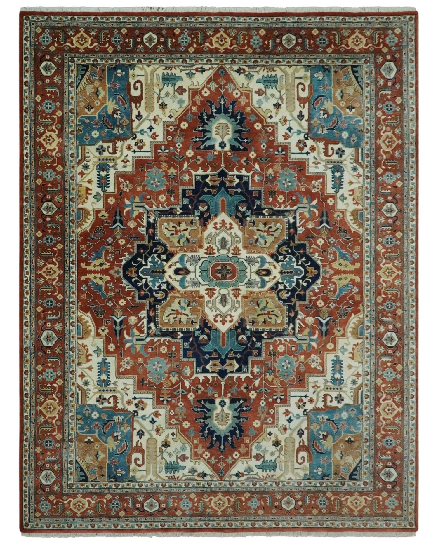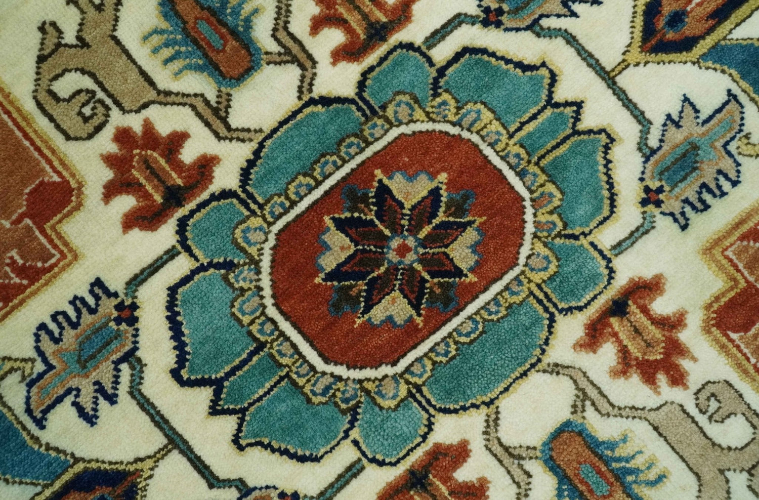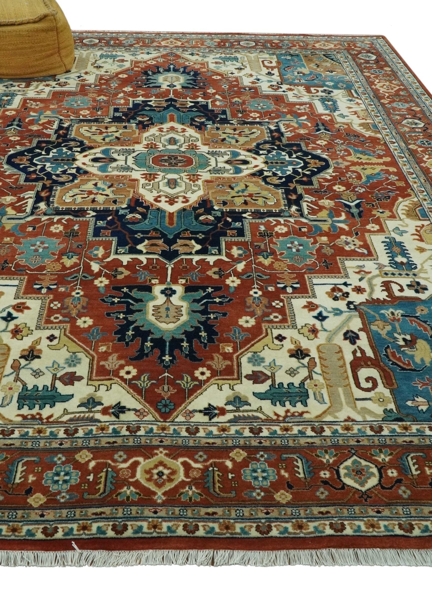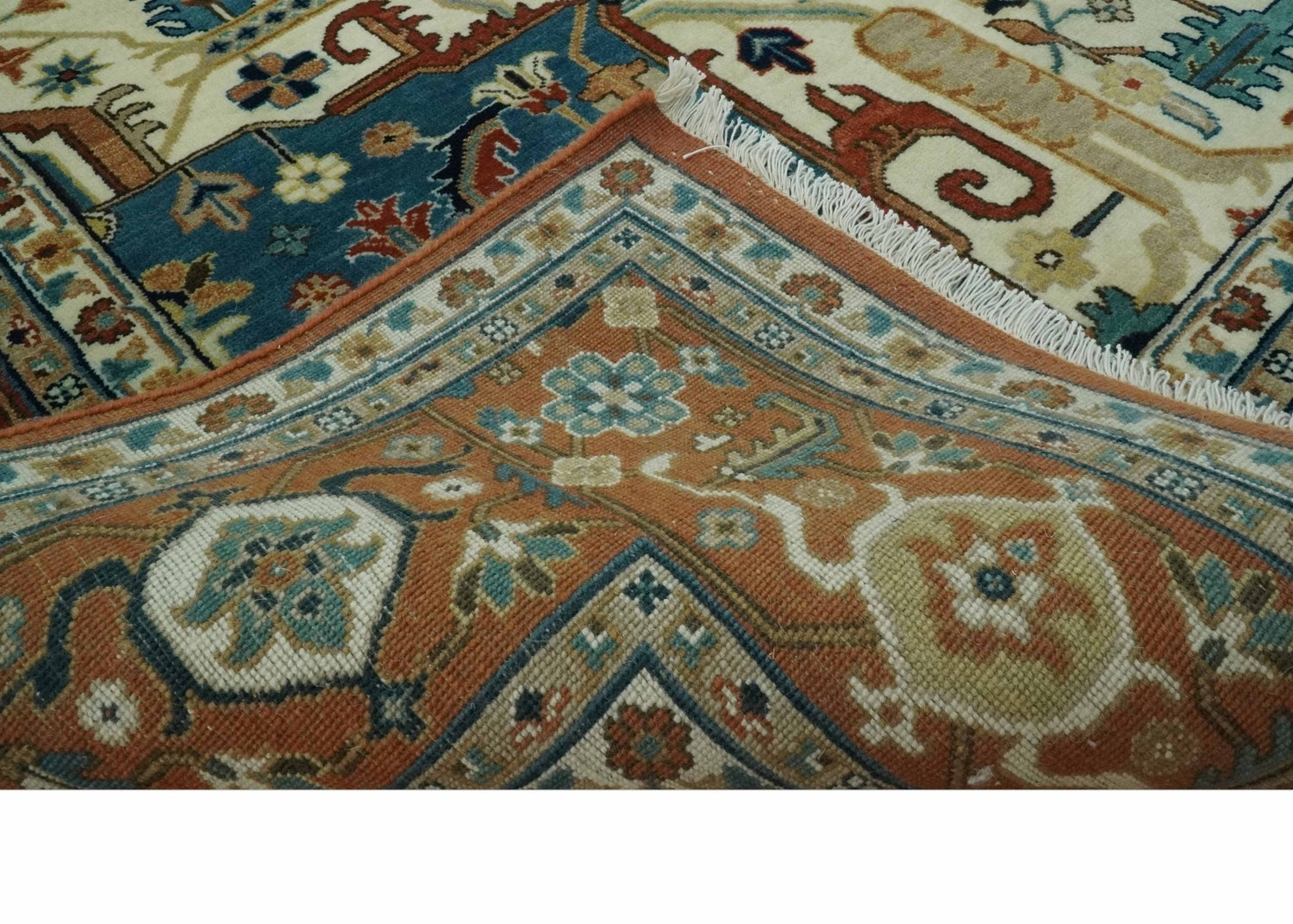 9x12 Fine Hand Knotted Rust, Ivory and Teal Traditional Heriz wool area rug - 8X10 is backordered and will ship as soon as it is back in stock.