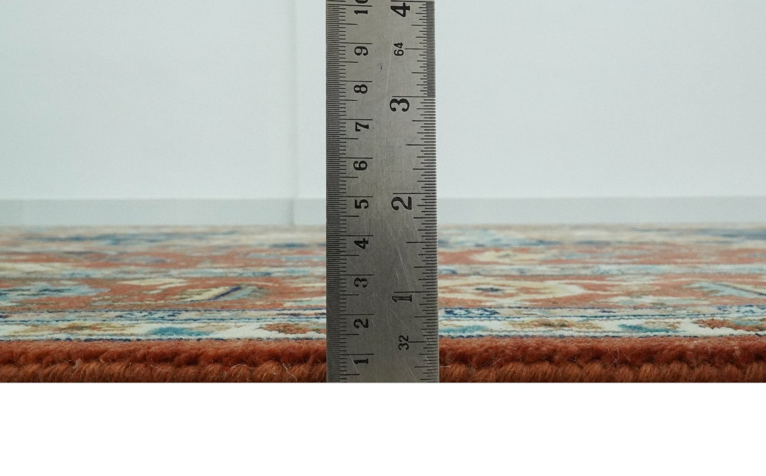 This 9x12 rug is fine hand-knotted with a blend of rust, ivory, and teal colors to create a traditional Heriz design. Made of high-quality wool, it adds elegance and warmth to any room. Expertly crafted for durability and comfort, this rug is a timeless addition to your home.