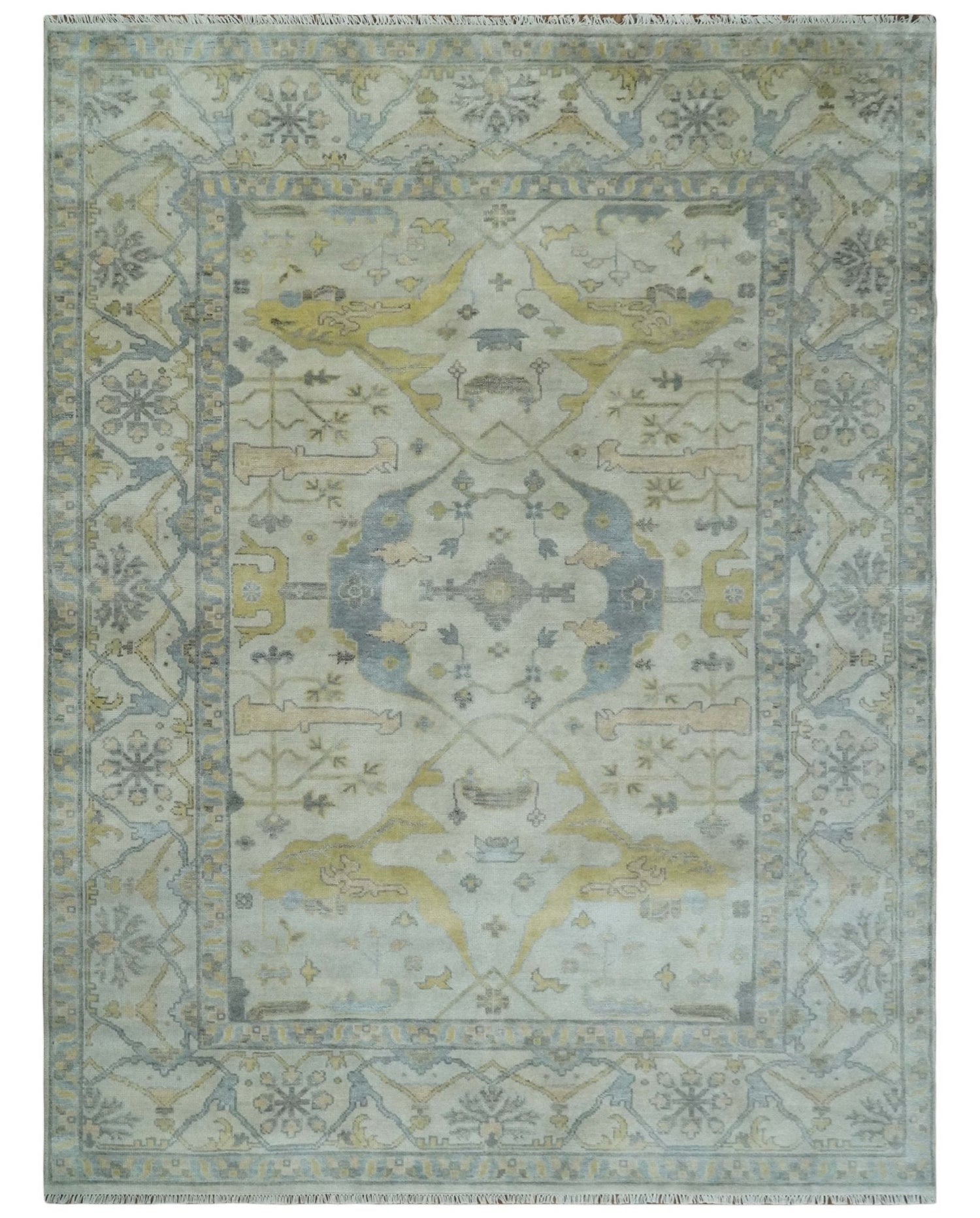 9x12 Hand Knotted Oriental Oushak Ivory, Charcoal and Yellow Wool Area Rug