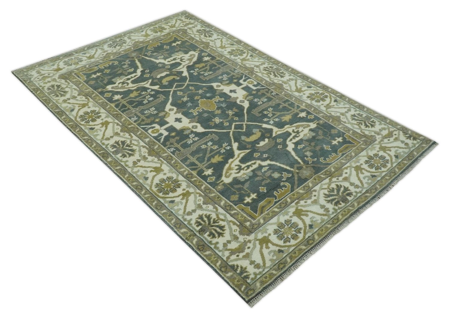 Antique look Charcoal, Ivory and Olive 6x9 Hand Knotted Traditional Oriental Oushak wool rug - 6x9 is backordered and will ship as soon as it is back in stock.