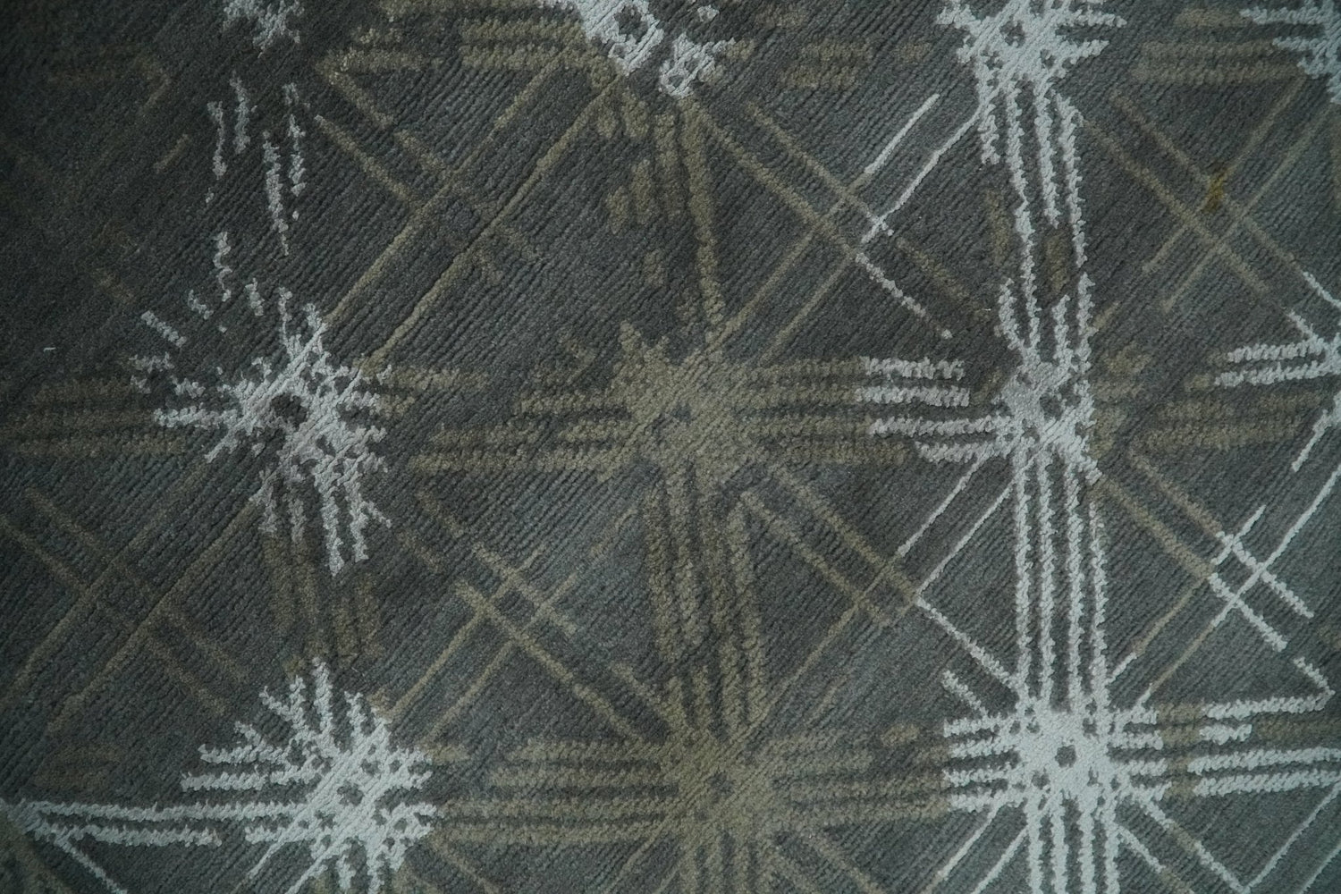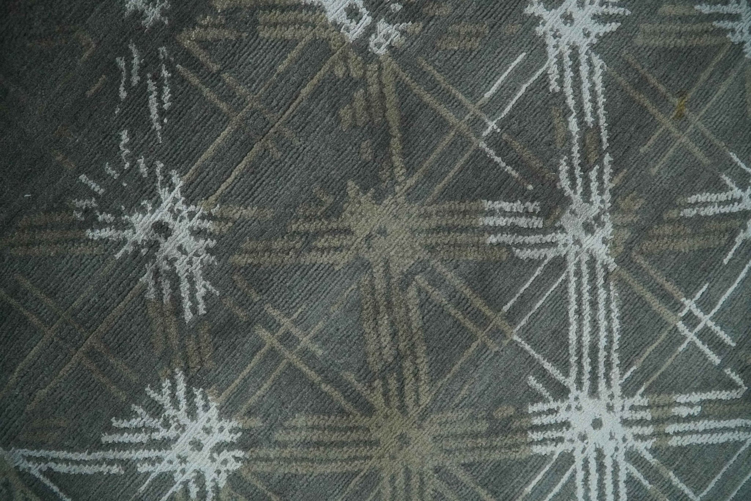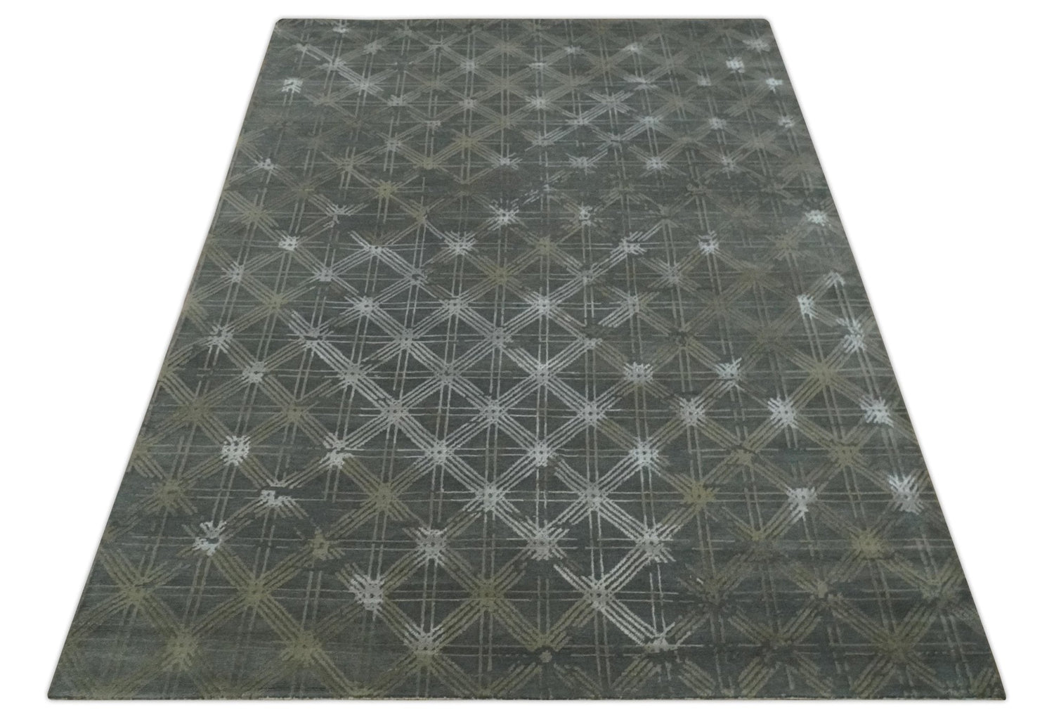 Antique look Charcoal, Ivory and Olive Geometrical Stripes Pattern Hand knotted 6x9 wool and Art Silk Area Rug - 6x9 is backordered and will ship as soon as it is back in stock.