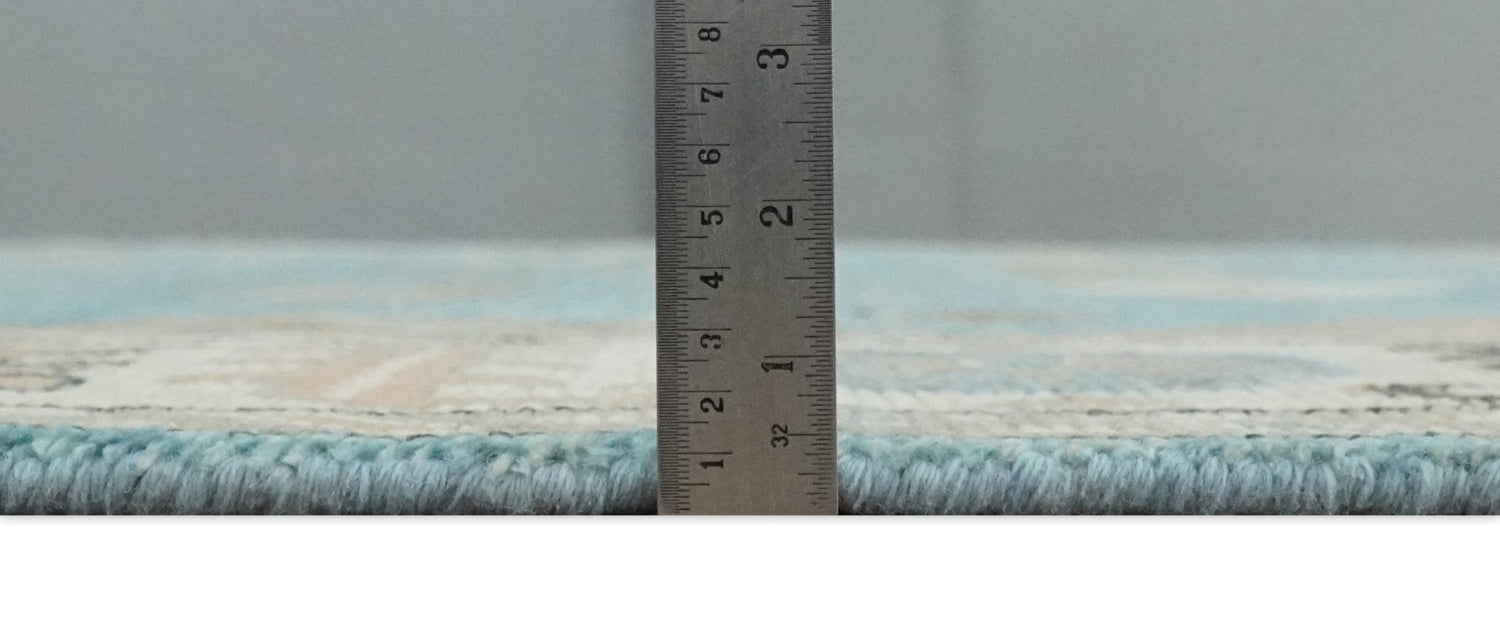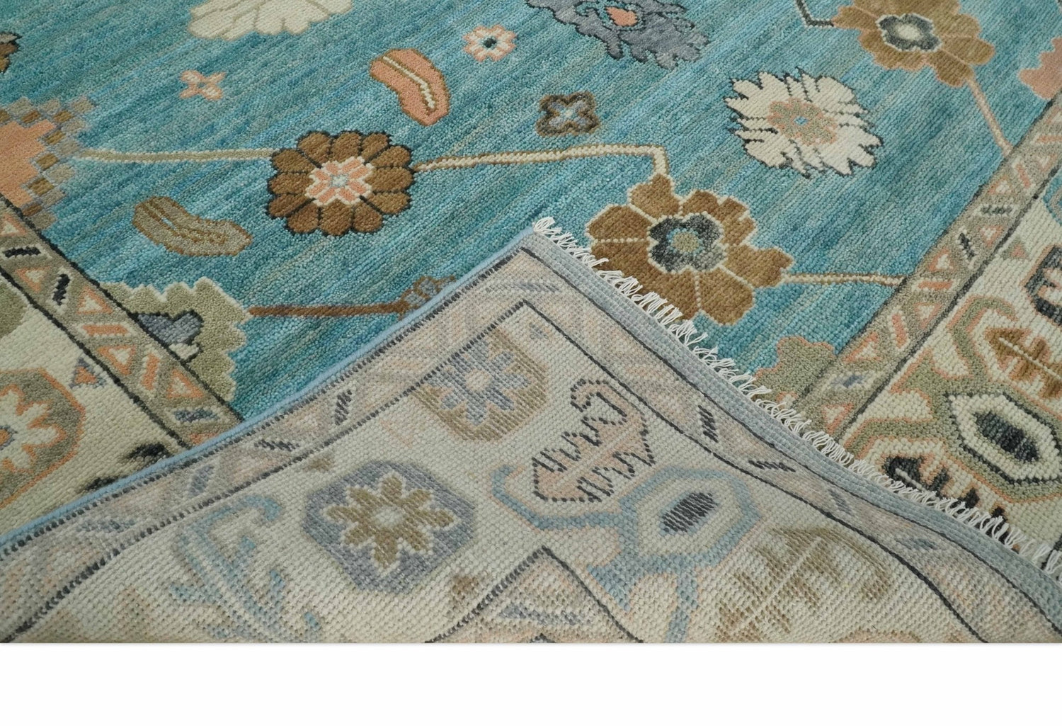 This 8x10 Oushak hand-knotted wool rug provides exquisite traditional detailing with its aqua blue and ivory palette. Crafted from premium wool, this gorgeous piece is perfect for bringing an elegant and sophisticated look to your living room. The accent peach detailing provides the perfect contrast to complete the look.