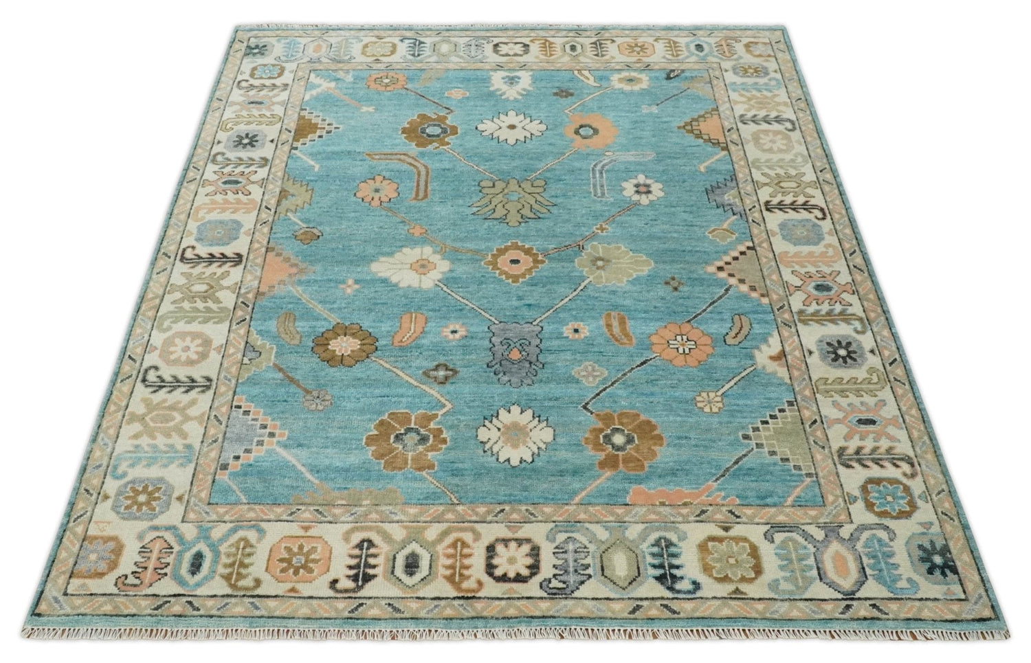 Aqua Blue and Ivory 8x10 Hand Knotted Wool Traditional Oushak Area Rug