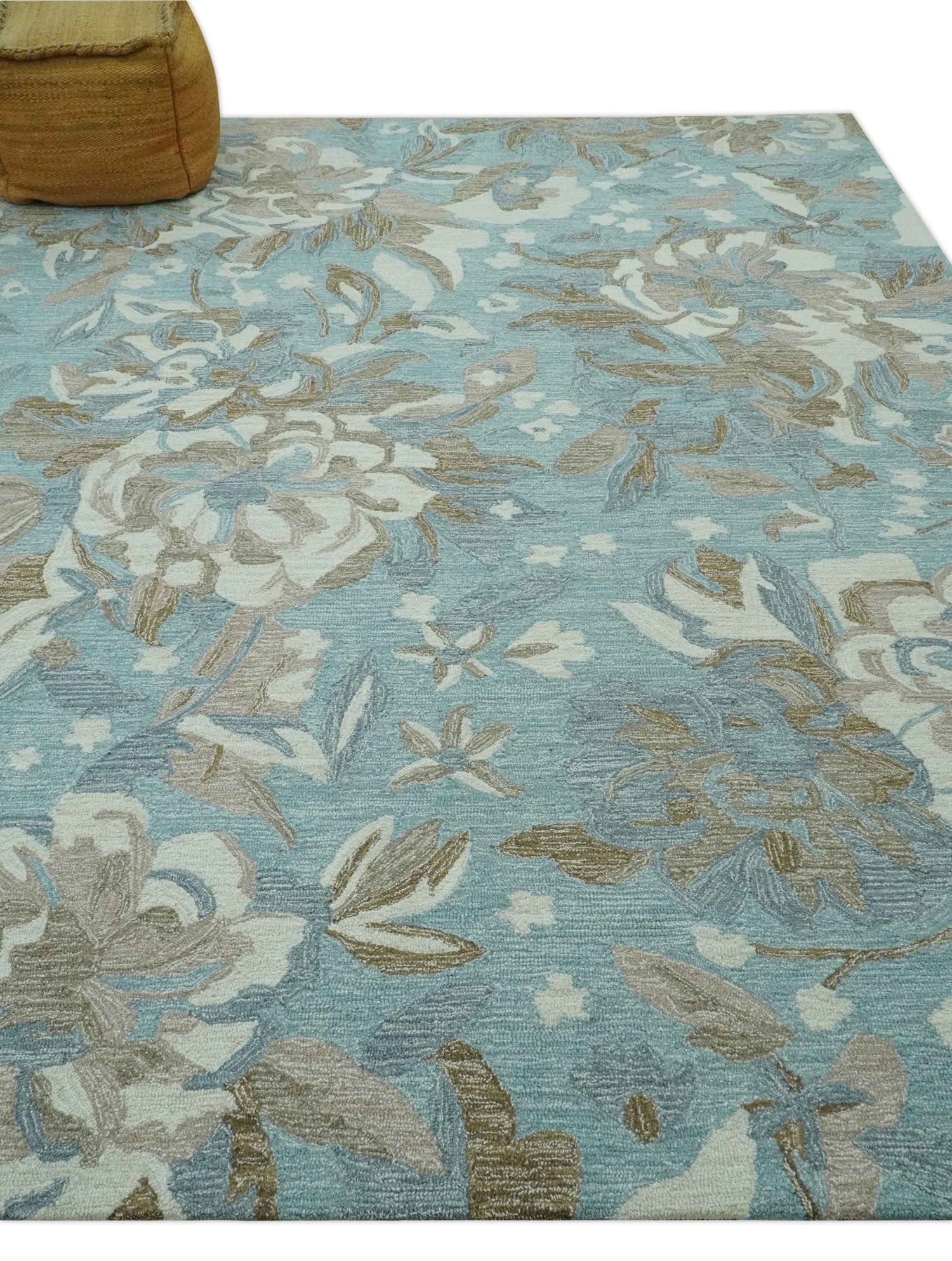 Beautiful Blue, Ivory and Olive Floral Design 8x10 Hand Tufted wool Rug