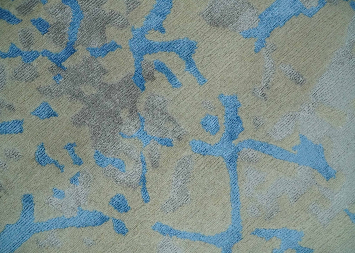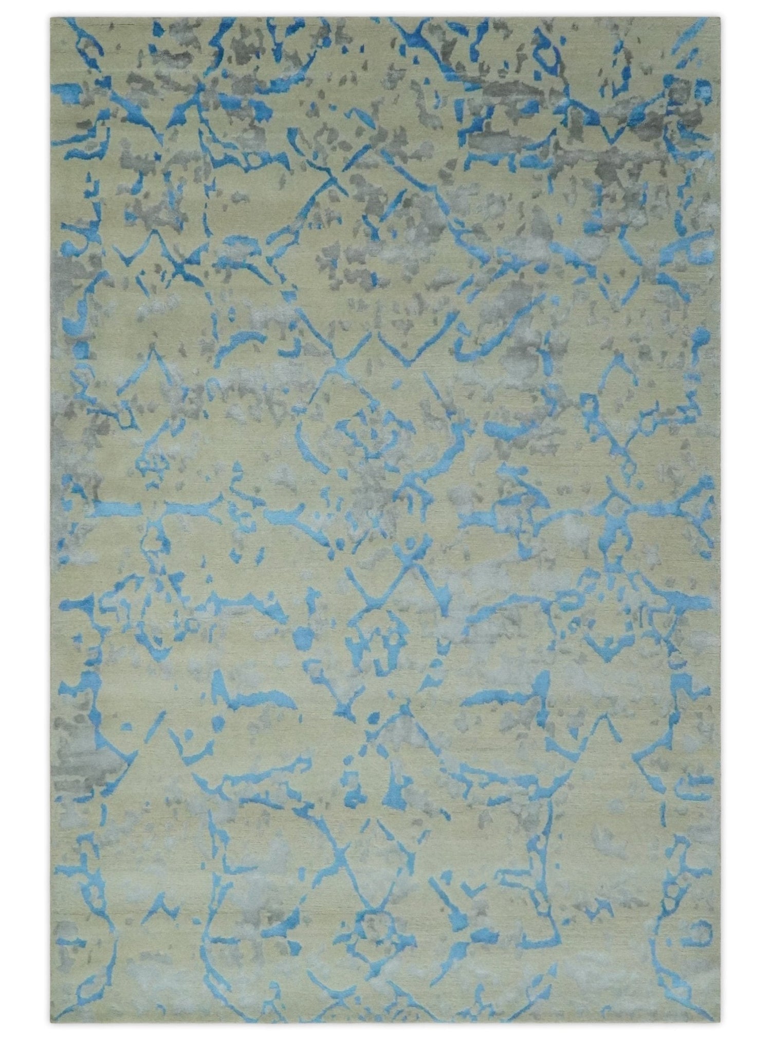 This striking 6x9 rug features a modern, abstract design in beige, blue, Olive and gray tones. Crafted with a hand-knotted wool and viscose blend, this unique piece will bring sophistication and style to any room.