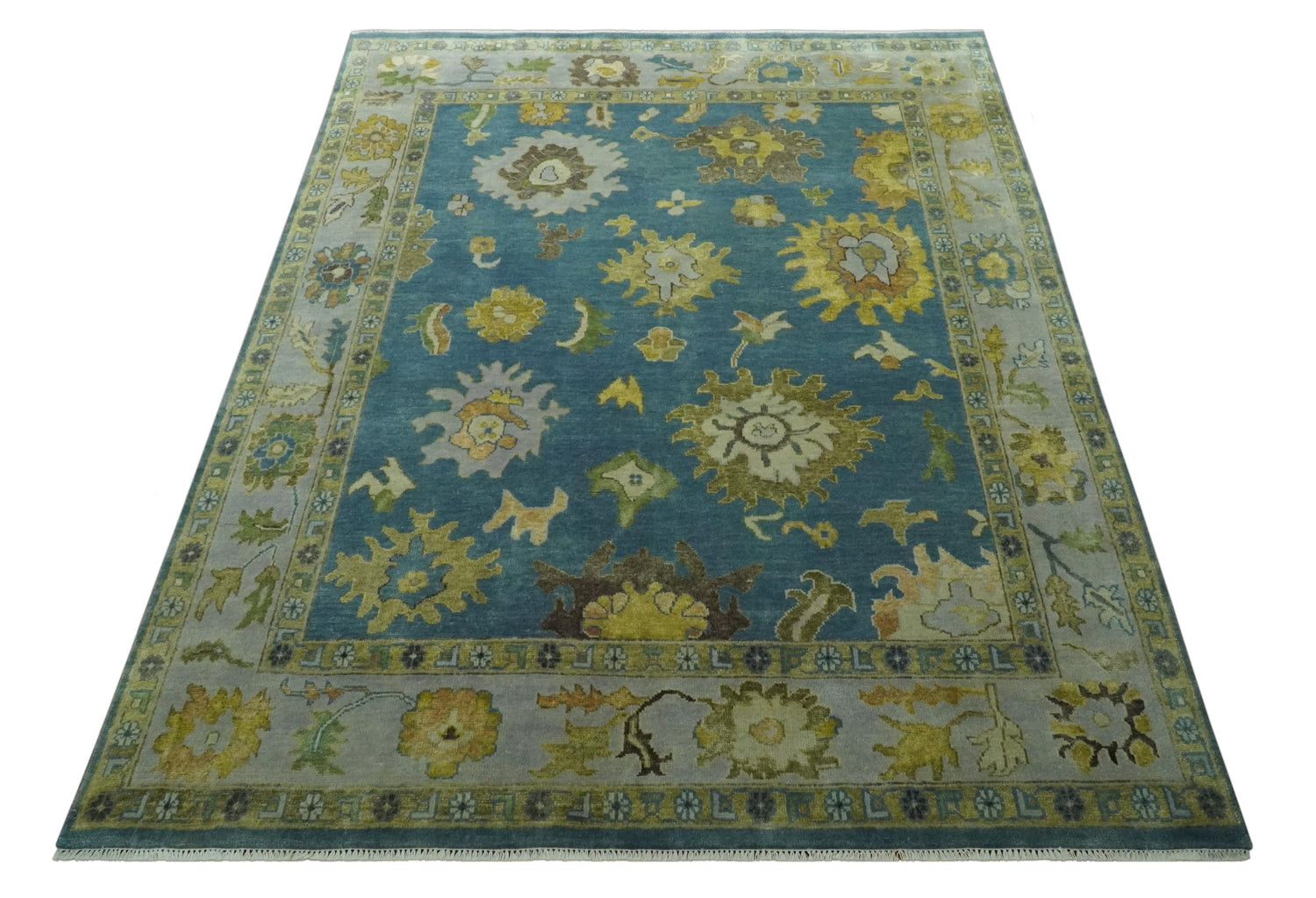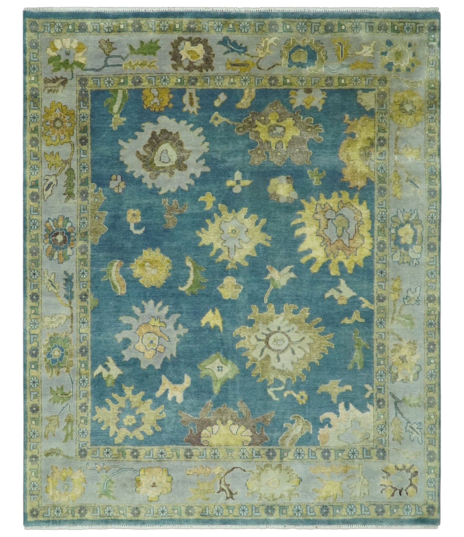 Blue, Silver and Olive 8x10 Hand knotted Traditional Oushak wool area rug