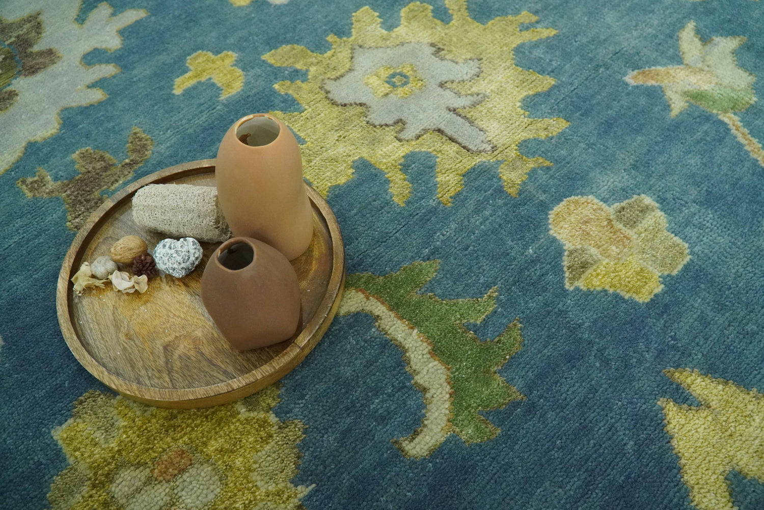 Blue, Silver and Olive 8x10 Hand knotted Traditional Oushak wool area rug - 8x10 is backordered and will ship as soon as it is back in stock.