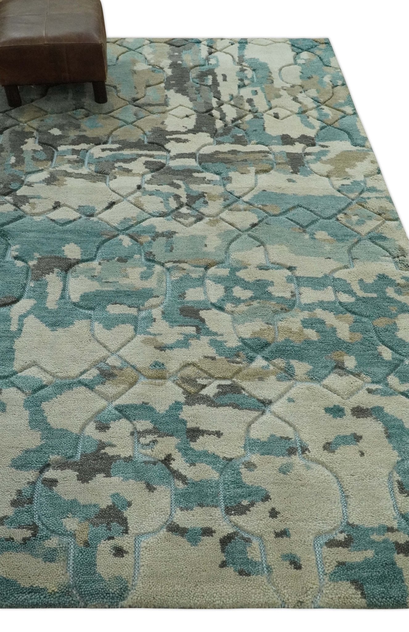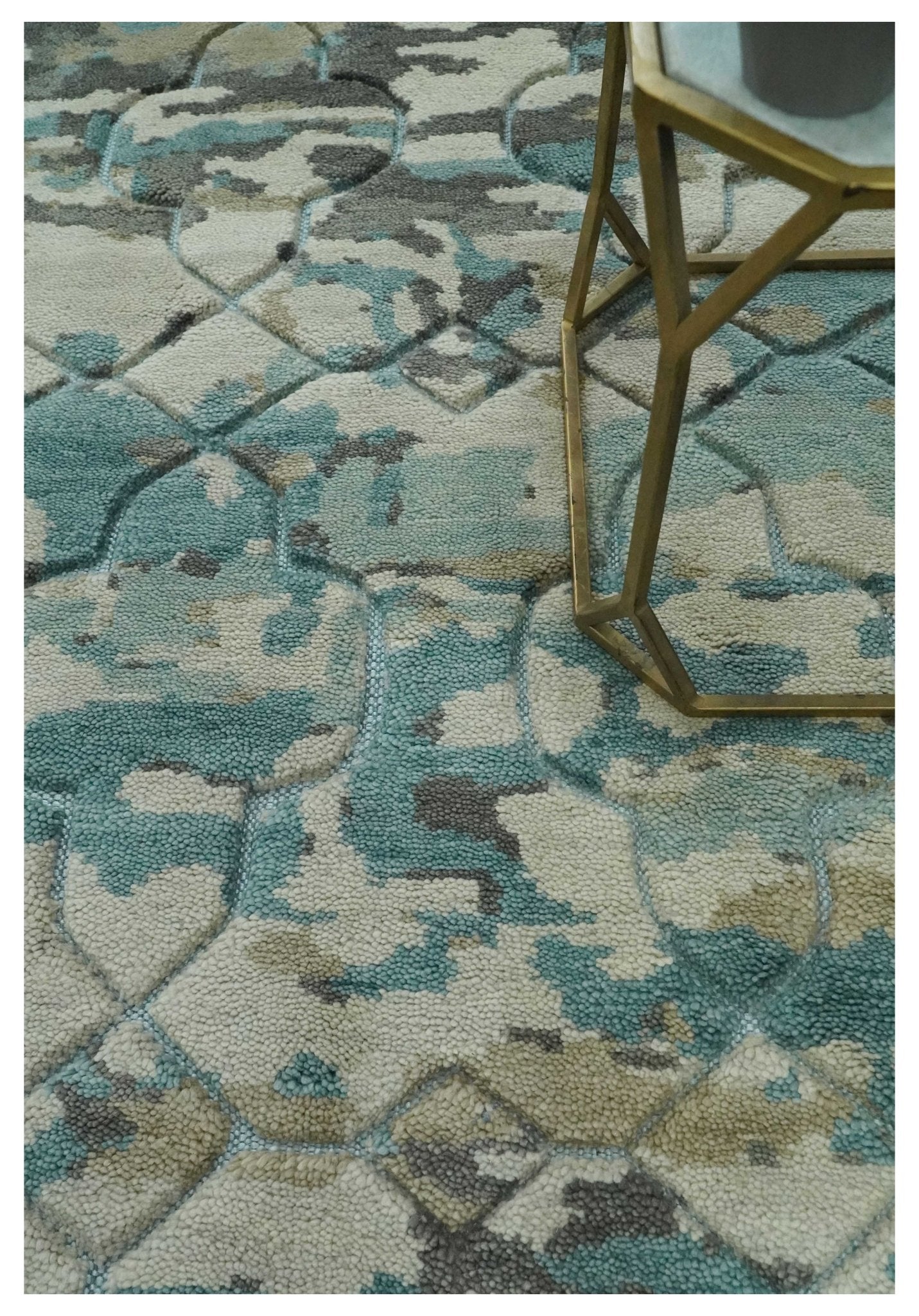 Carved Texture Ivory, Blue, Olive and Charcoal Modern Abstract 5x8 Hand Knotted wool Area Rug