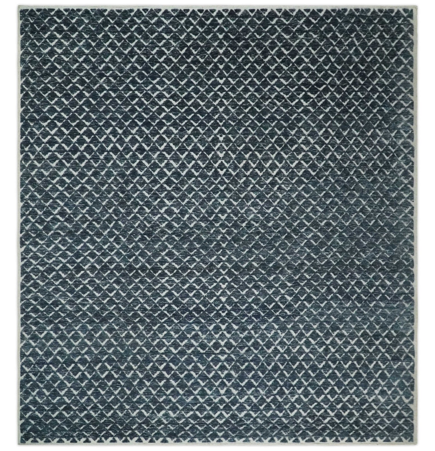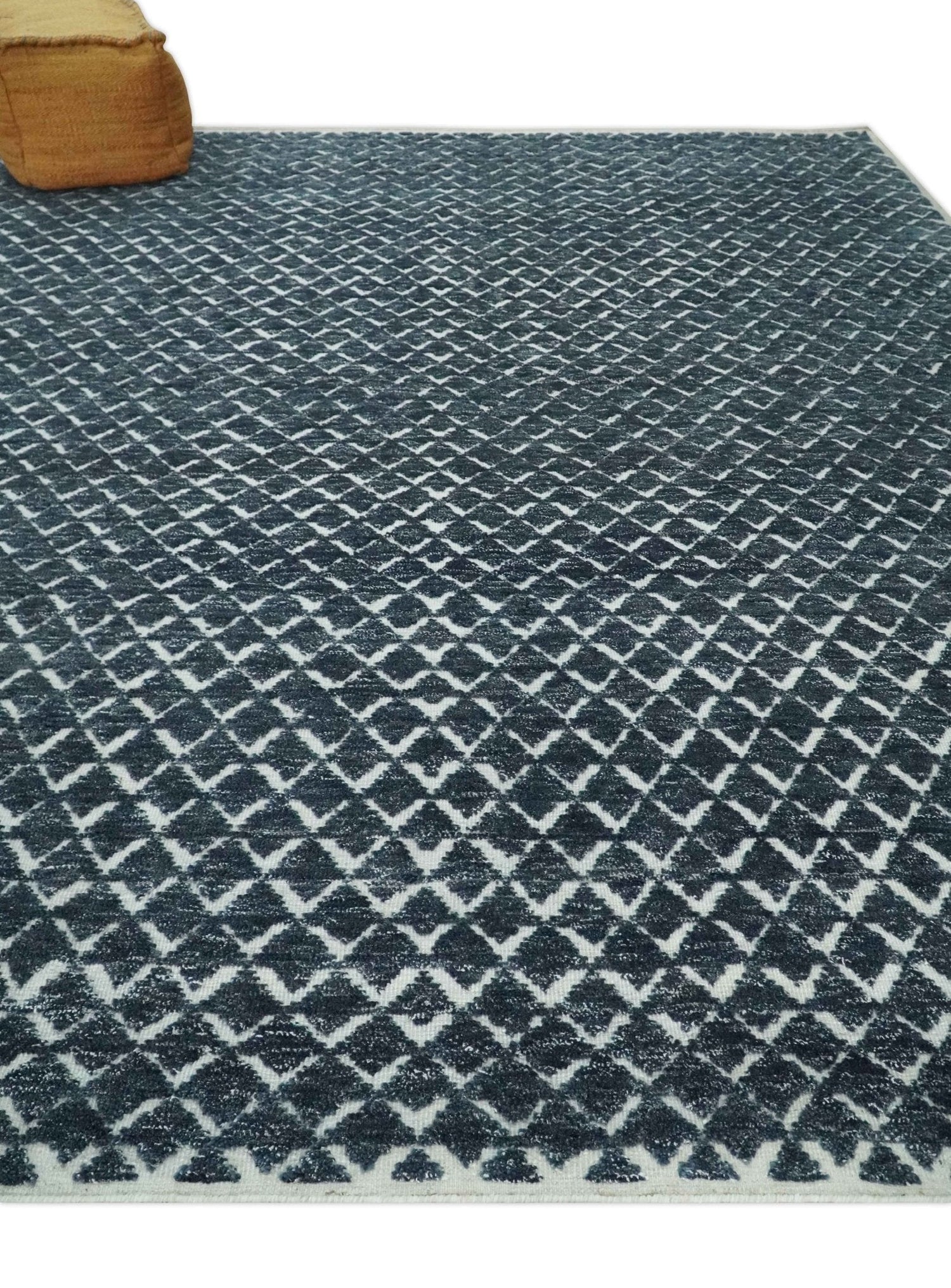 This beautiful hand-knotted wool rug features a hand-carved geometrical design in hues of blue, charcoal, and ivory. Designed to last, this rug is perfect for adding a touch of sophistication to any home.