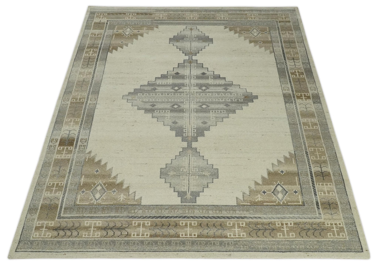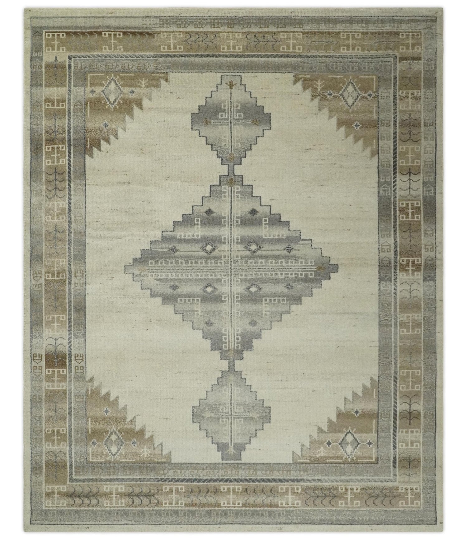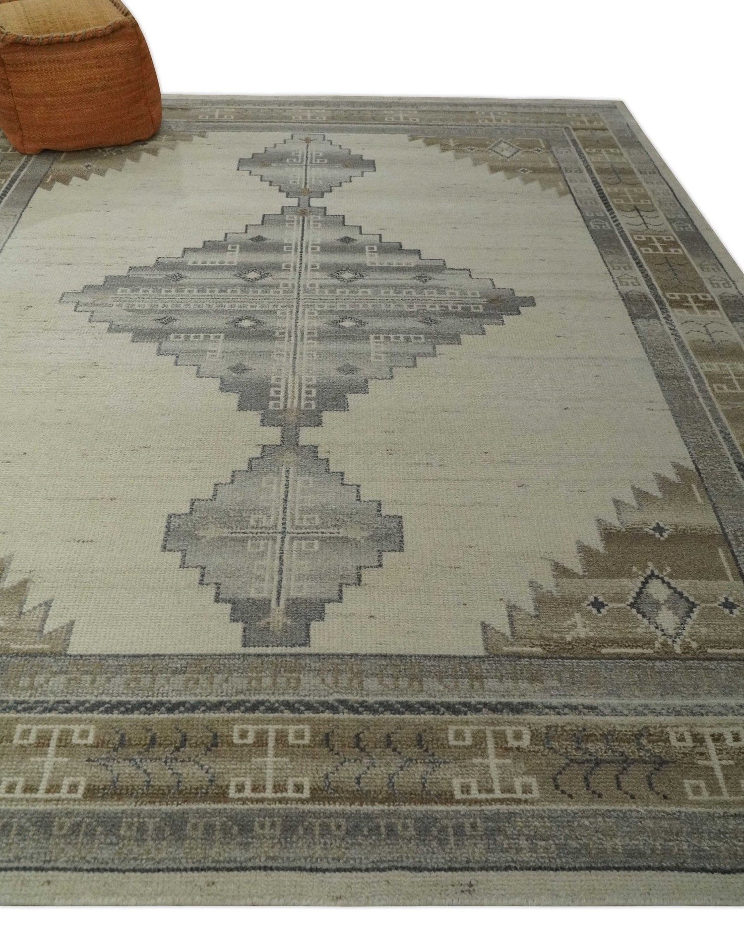 Custom Made Earthy Hand Knotted Ivory, Charcoal and Beige Wool Area Rug