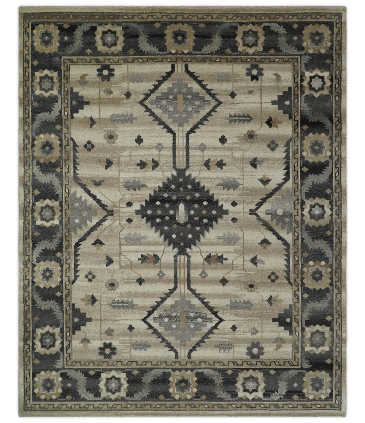 Custom Made Hand Knotted Ivory, Charcoal and Beige Traditional Wool Area Rug