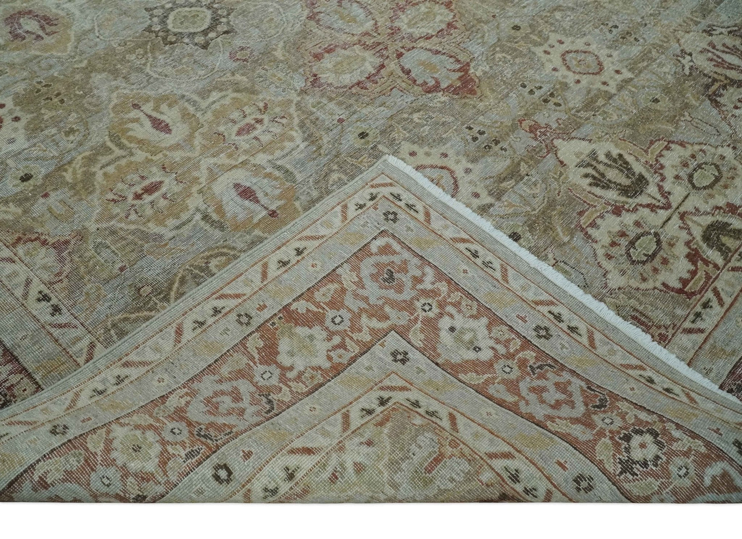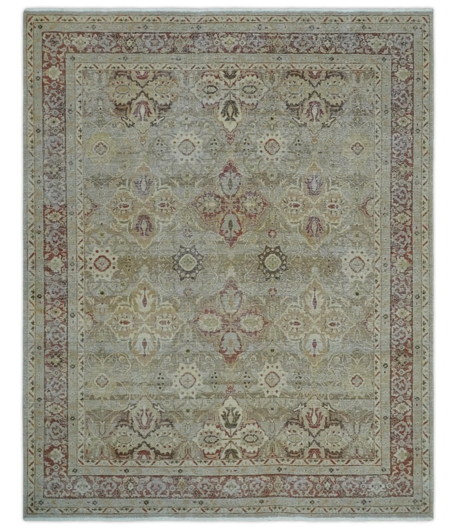 Custom Made Hand Knotted Olive and Rust Distressed Traditional Antique Look Wool Rug
