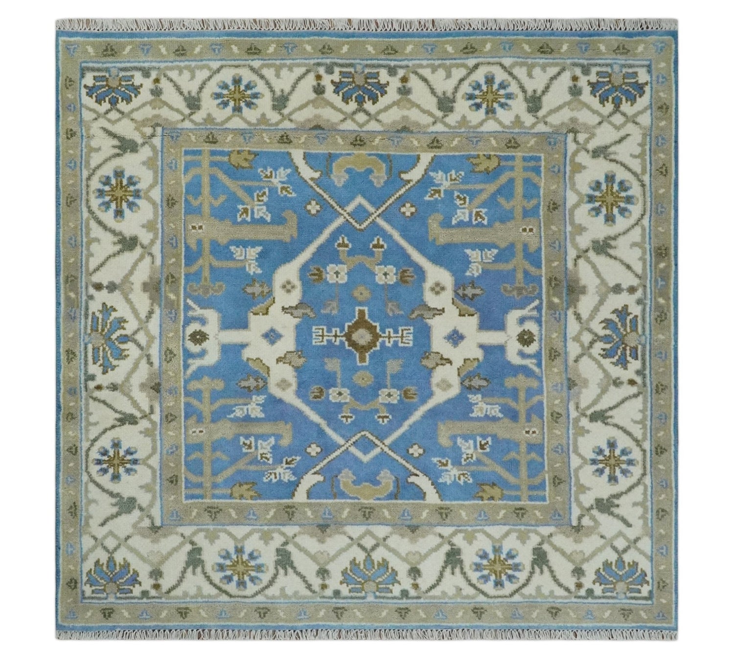 Custom Made Hand Knotted Oriental Oushak Blue and Ivory Wool Area Rug