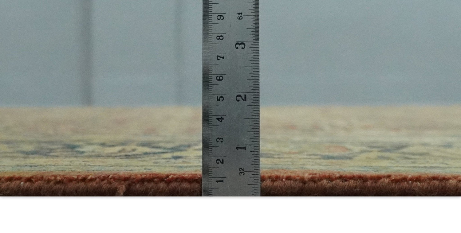 This specific rug is made in India, in the city of Bhadohi. Bhadohi is one of the biggest rug manufacturing cities. Carpet weaving in the region dates back to the 16th century during the reign of Akbar. The skilled artisans of Bhadohi have been carrying the tradition of rug-making for centuries.