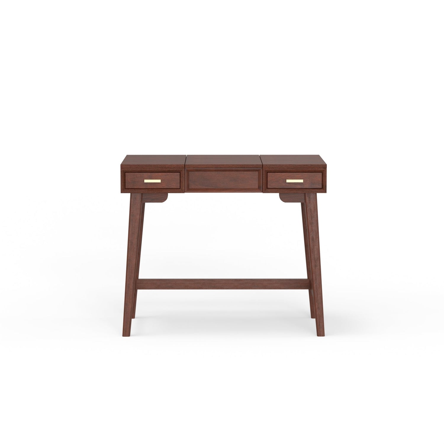The streamlined design of the Arden mid-century bedroom vanity is compact, with a retractable mirror for a variety of makeup or jewelry functionality . Simplify your morning routine, retract the top of this vanity table to reveal a beautiful mirror and a selection of organized felt lined compartments, making everything available when you need it. When you’re finished, fold it back down to use it as a desk when its time to get some work done. Made of durable Mahogany wood solids and veneer, this bedroom vanity will adorn your home for years to come. Light assembly required. Coordinate with other pieces from the Arden bedroom collection.